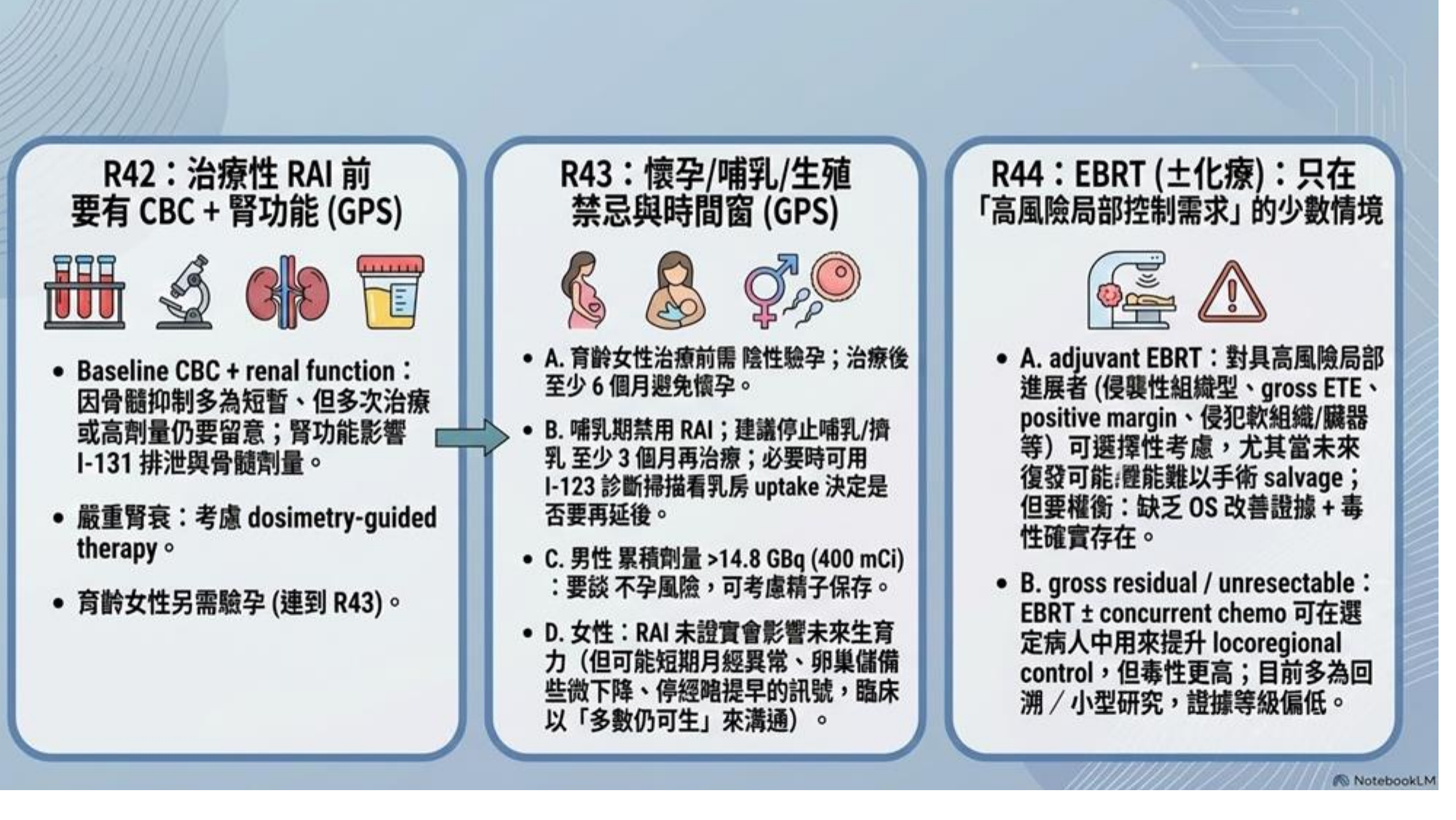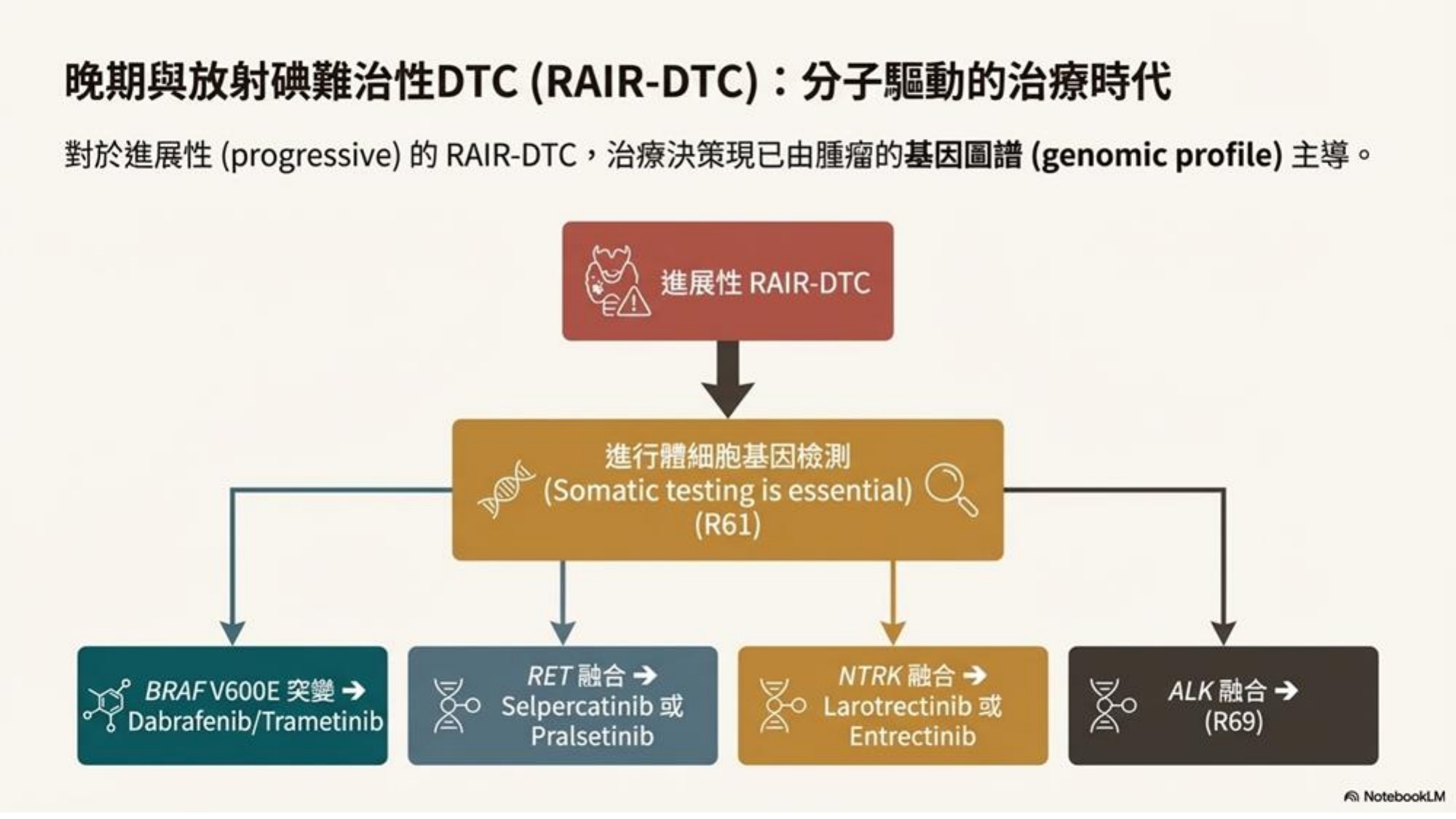 對於放射碘難治型 (RAIR) 病人,進入分子驅動時代,需進行基因檢測 (Somatic Testing) 以尋找標靶治療機會 (如 BRAF, RET, NTRK 抑制劑)。