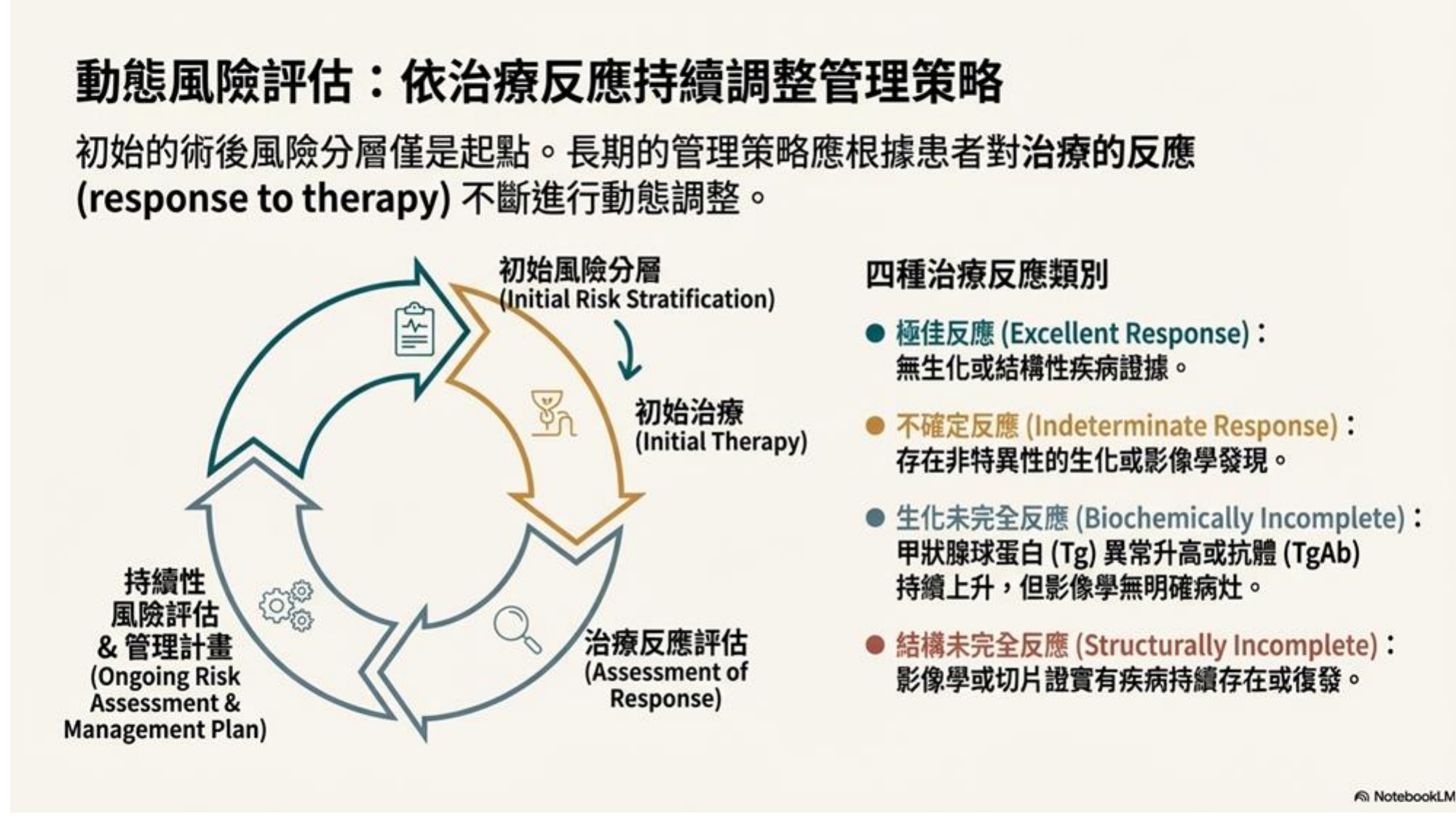 - 循環: 治療 -> 評估反應 -> 調整風險分層 -> 決定下一步 (再治療或觀察)。