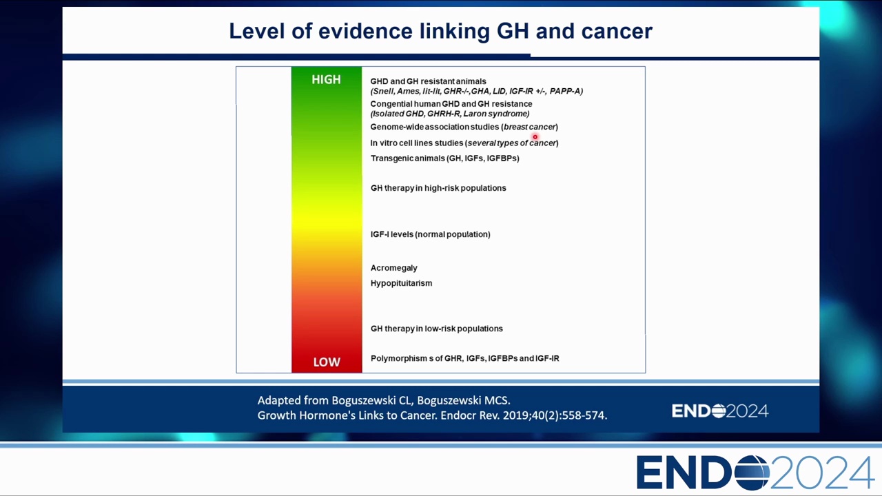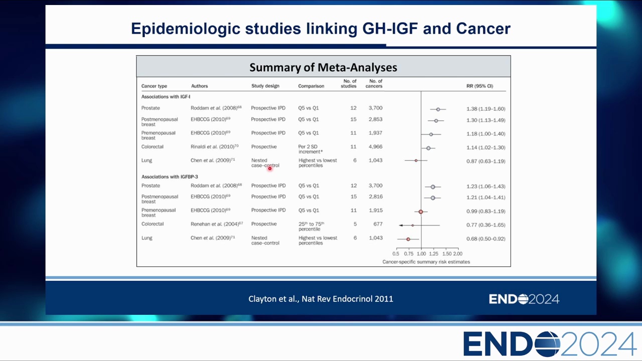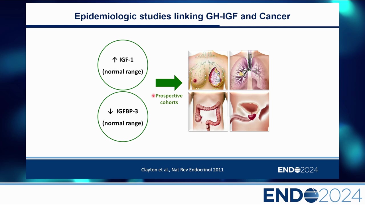 演講的主要目的是分享關於實驗性、流行病學及臨床證據的知識,探討 GH-IGF 系統在致癌過程(Carcinogenesis)中扮演的允許性角色(permissive role),特別是區分「內分泌(Endocrine)」路徑與「自體/旁分泌(Autocrine-Paracrine)」路徑的差異。同時評估肢端肥大症(Acromegaly)患者的癌症風險,以及使用重組人類生長激素(rhGH)治療時,對於腫瘤復發或第二原發腫瘤的高風險族群識別。