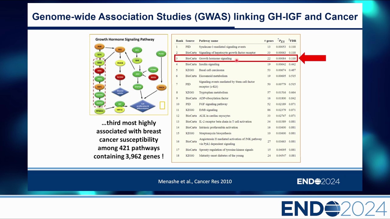 Slides 延伸補充:GWAS 數據細節 在包含近 4000 個基因的分析中,GH Signaling Pathway 排名第 3 (P=0.00034),僅次於 Syndecan-1 和 HGF 受體路徑,顯示其與乳癌風險的遺傳關聯性極強。