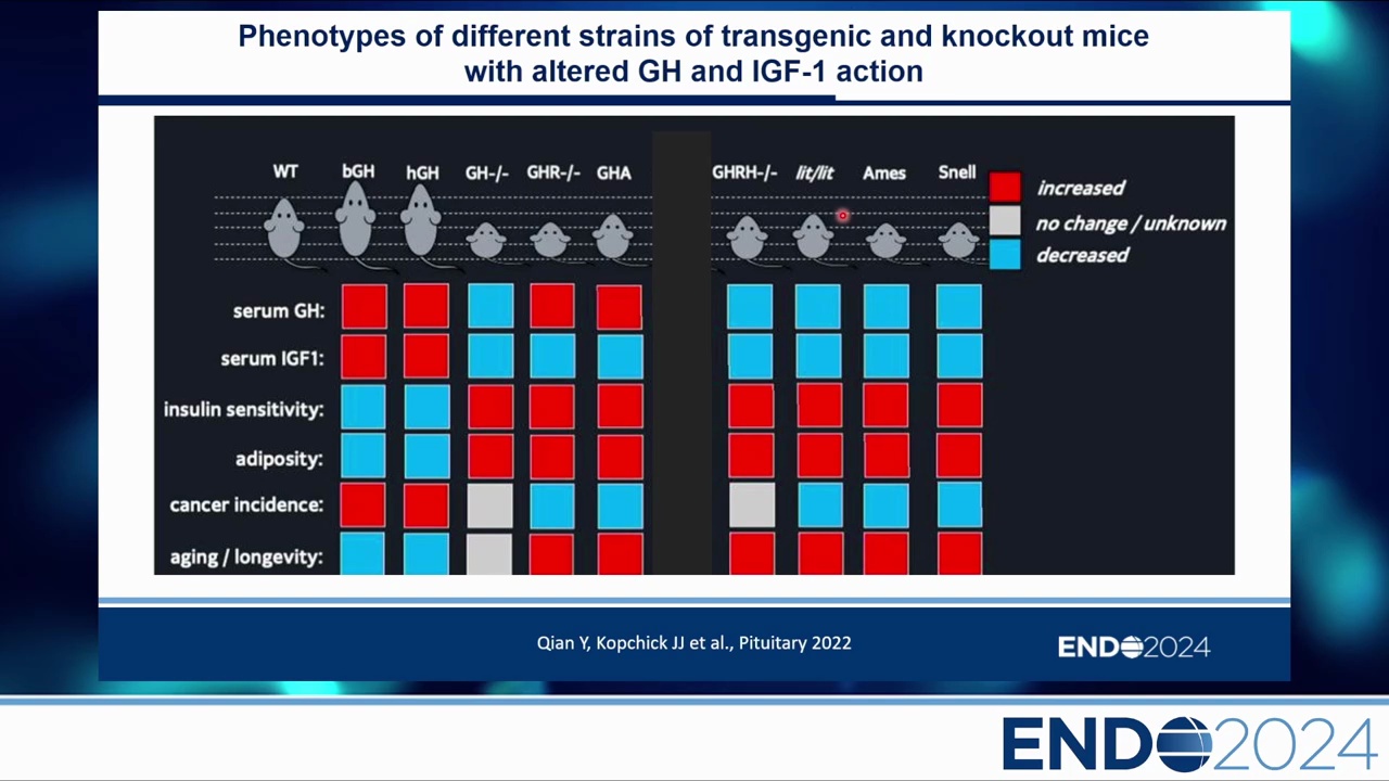 透過 John Kopchick 實驗室的轉基因小鼠模型,可以清楚看見 GH/IGF-1 濃度與壽命及癌症的關係: