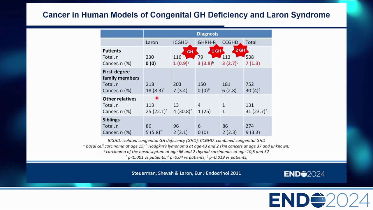 - 相比之下,這些患者的第一等親屬 (First degree family members) 癌症率顯著較高 (如 Laron 親屬為 8.3%, p<0.001)。這證實了 GH/IGF-1 缺乏確實提供了某種程度的癌症保護。