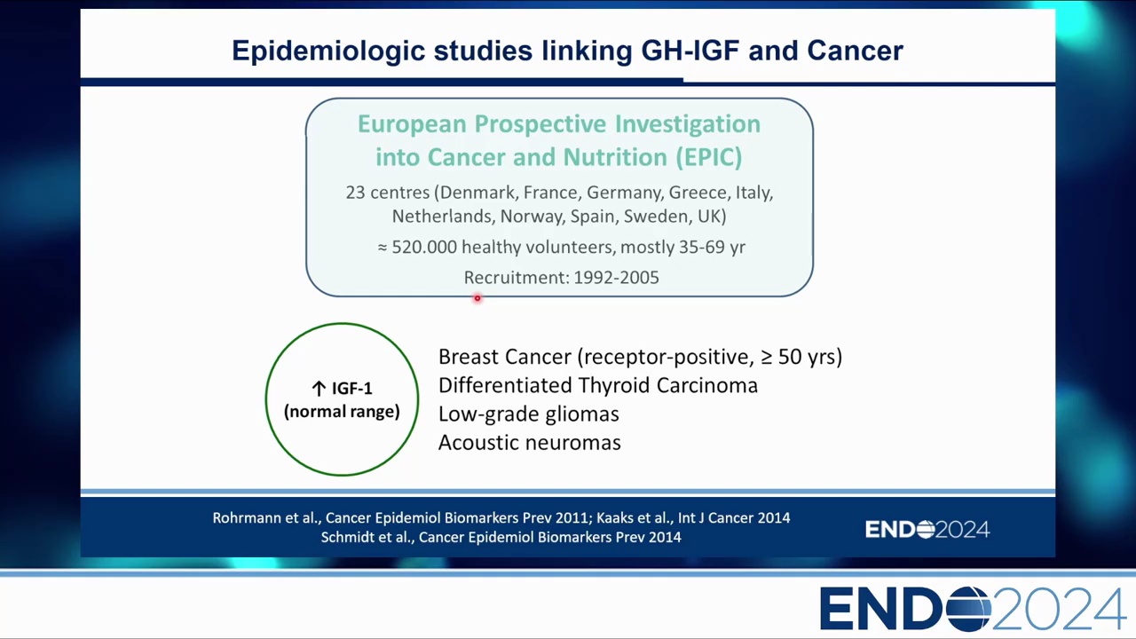 - 高正常範圍(High-normal)的 IGF-1 與乳癌、前列腺癌、大腸直腸癌風險增加有關。