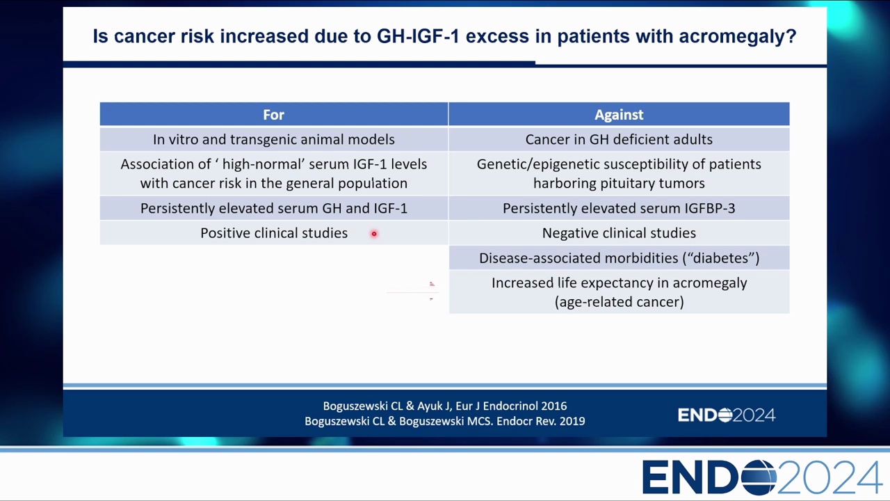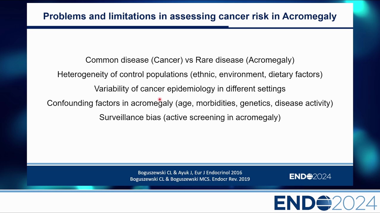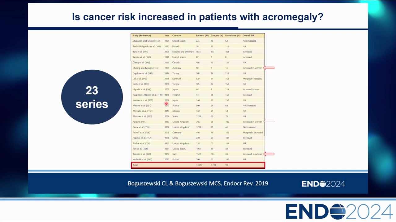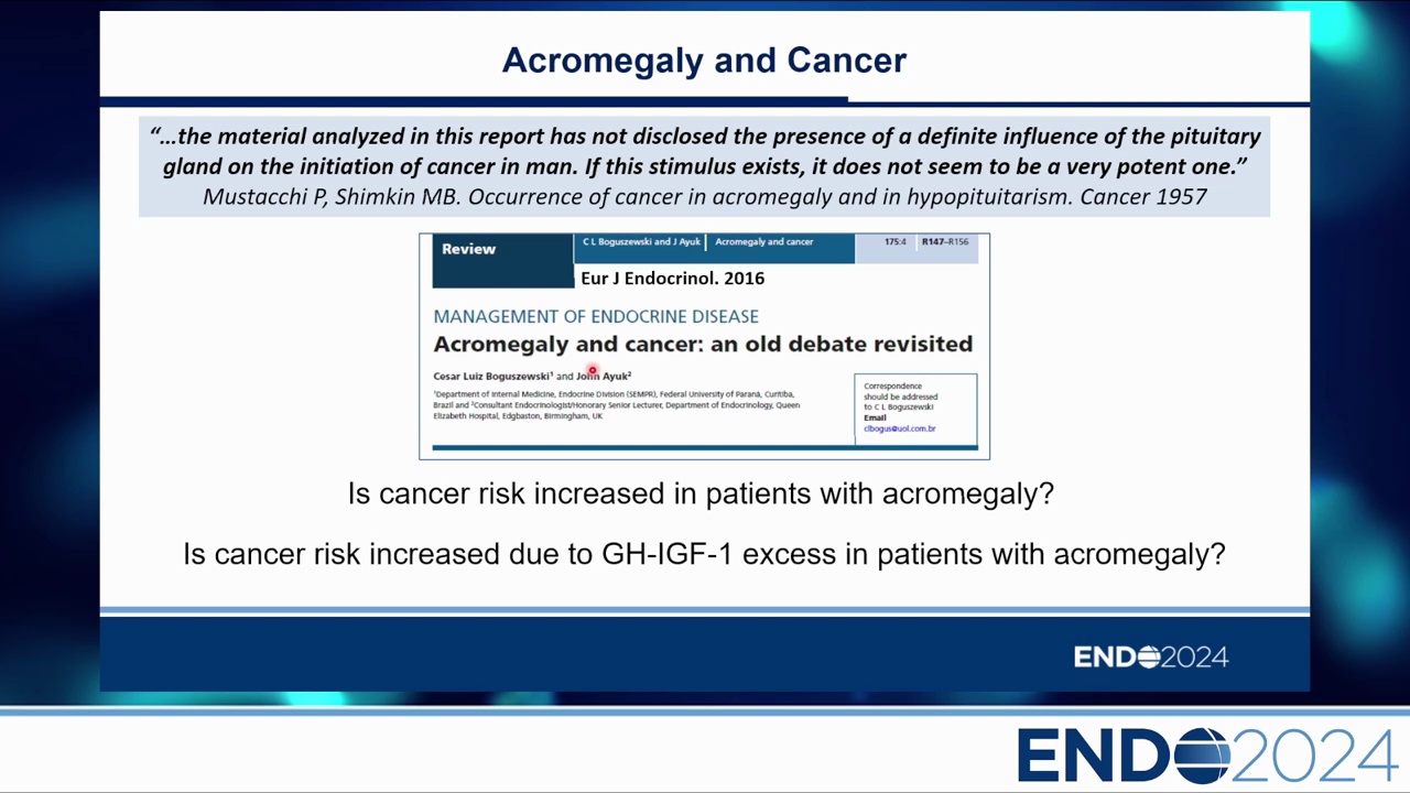 自 1957 年 Mustacchi & Shimkin 的報告以來,關於肢端肥大症是否增加癌症風險一直存在爭議。回顧 1957-2018 年的 23 個系列研究,結論是「一團混亂(Big Mess)」: