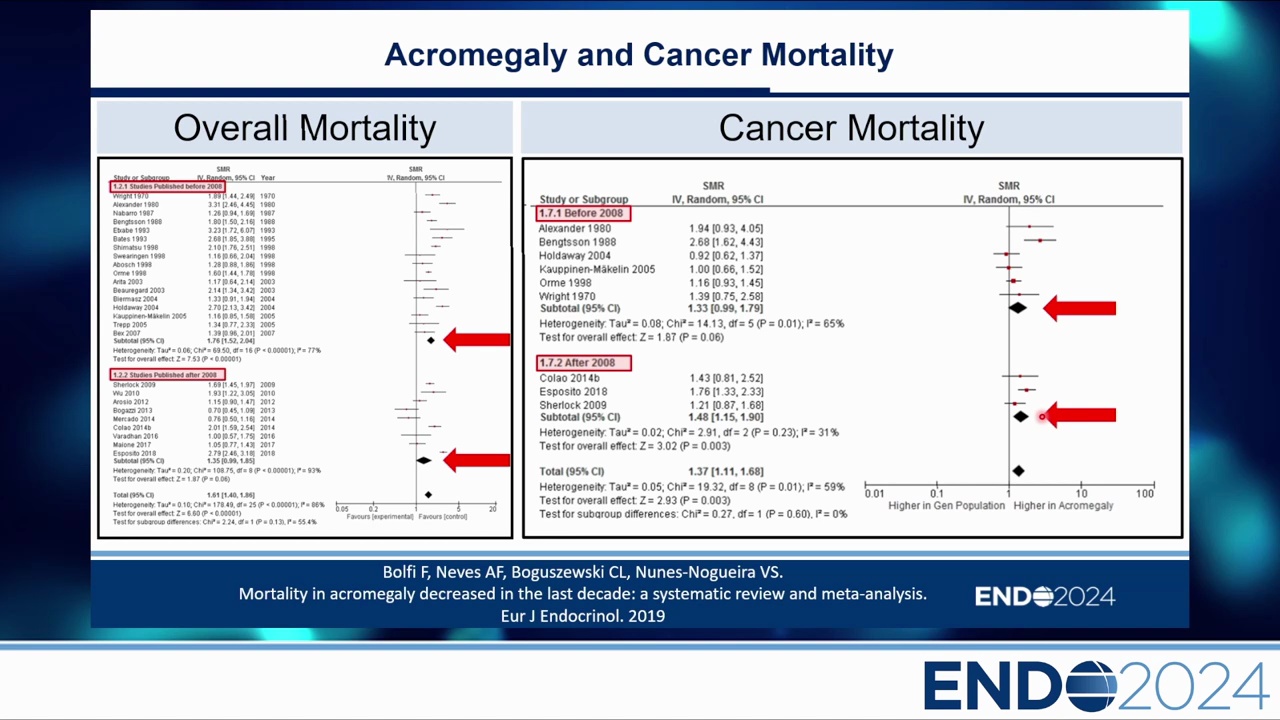 2008 年後發表的研究顯示,肢端肥大症的總體死亡率已趨於正常(歸功於更好的治療),但癌症死亡率卻相對上升。這被解讀為:患者活得夠久了,因此開始罹患與年齡相關的癌症,而非單純由 GH 過量直接導致。