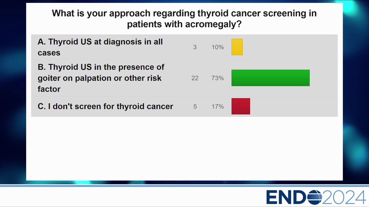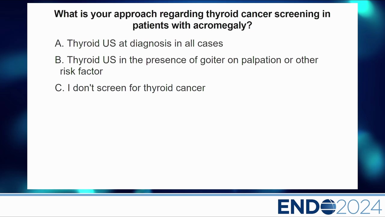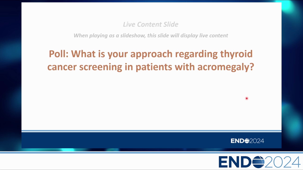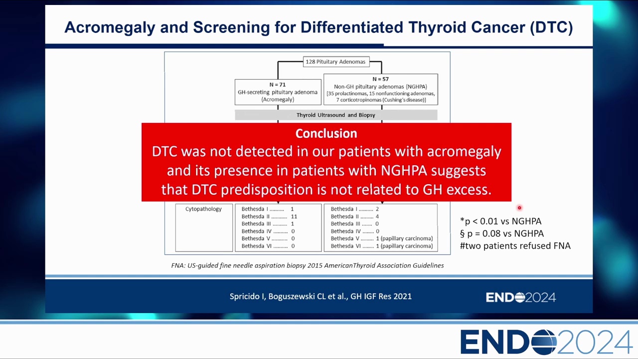 - 研究數據:講者團隊的研究顯示,肢端肥大症患者雖然甲狀腺體積較大,但在 71 例患者中並未發現甲狀腺癌,反而在對照組(非 GH 腫瘤)中發現了 2 例。這暗示甲狀腺癌風險可能與 GH 過量無直接關聯。