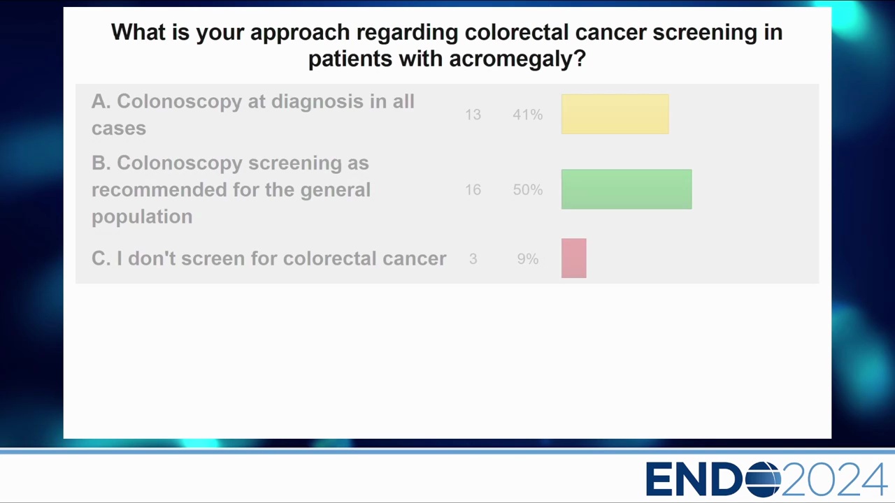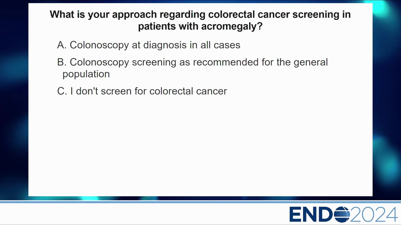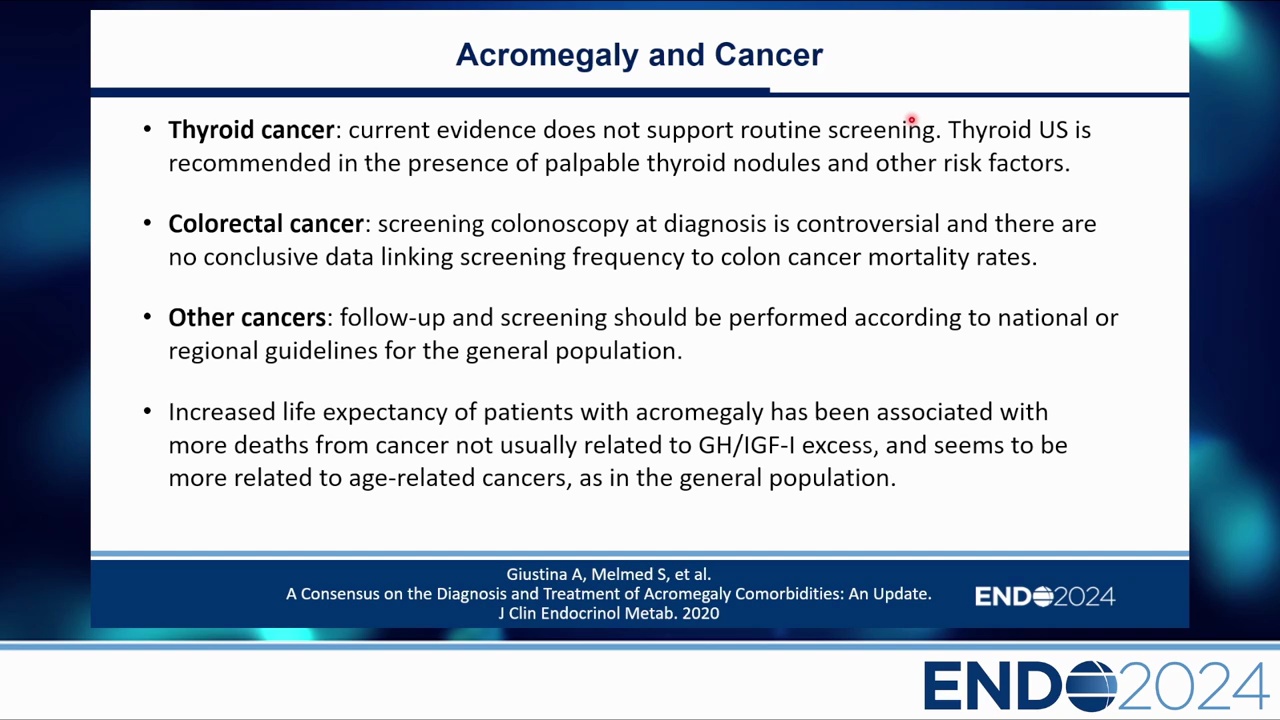 - 結論:目前的共識傾向於依據一般人群或國家指引,除非有特定風險。如果基線大腸鏡正常且 IGF-1 控制良好,可每 10 年追蹤一次。