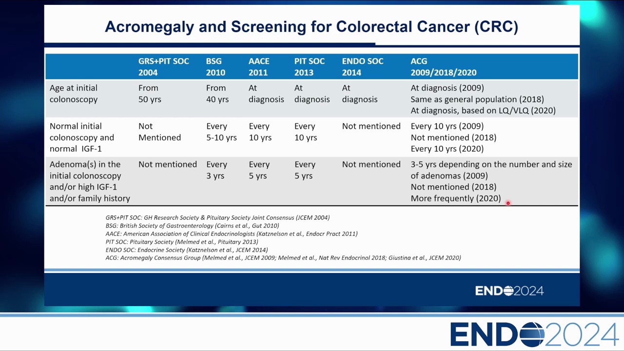 - 指引混亂:各學會(Acromegaly Consensus Group, Endocrine Society 等)的建議不一致。有的建議診斷時必做,有的建議 40 或 50 歲開始。