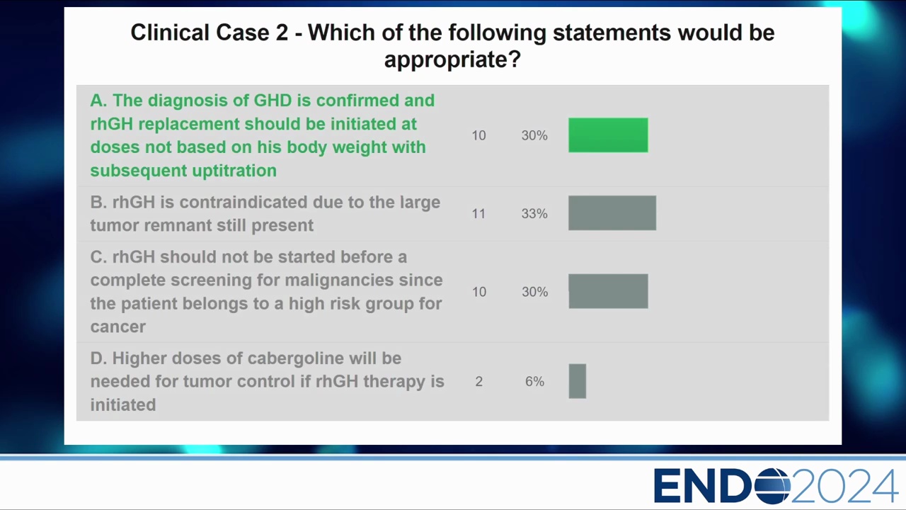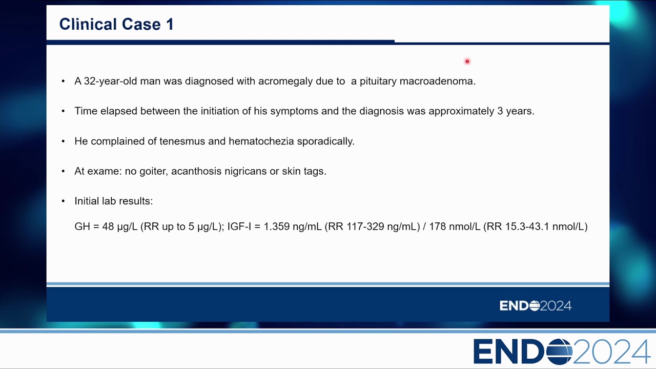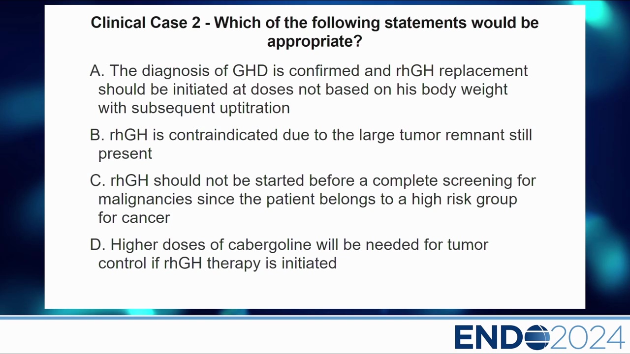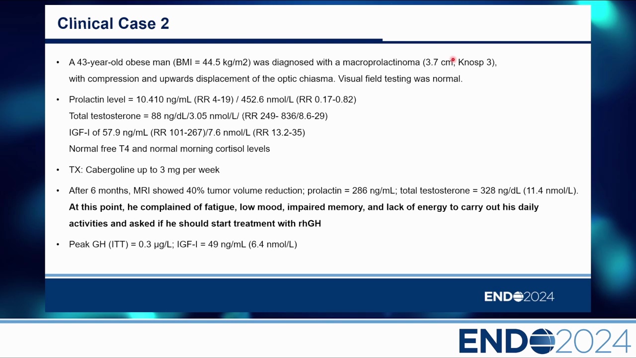 - 案例:43 歲男性,巨大泌乳素瘤(Macroprolactinoma),經藥物治療後腫瘤縮小但仍有殘留,出現典型 GH 缺乏症狀(疲勞、記憶力差),確診 GHD。
