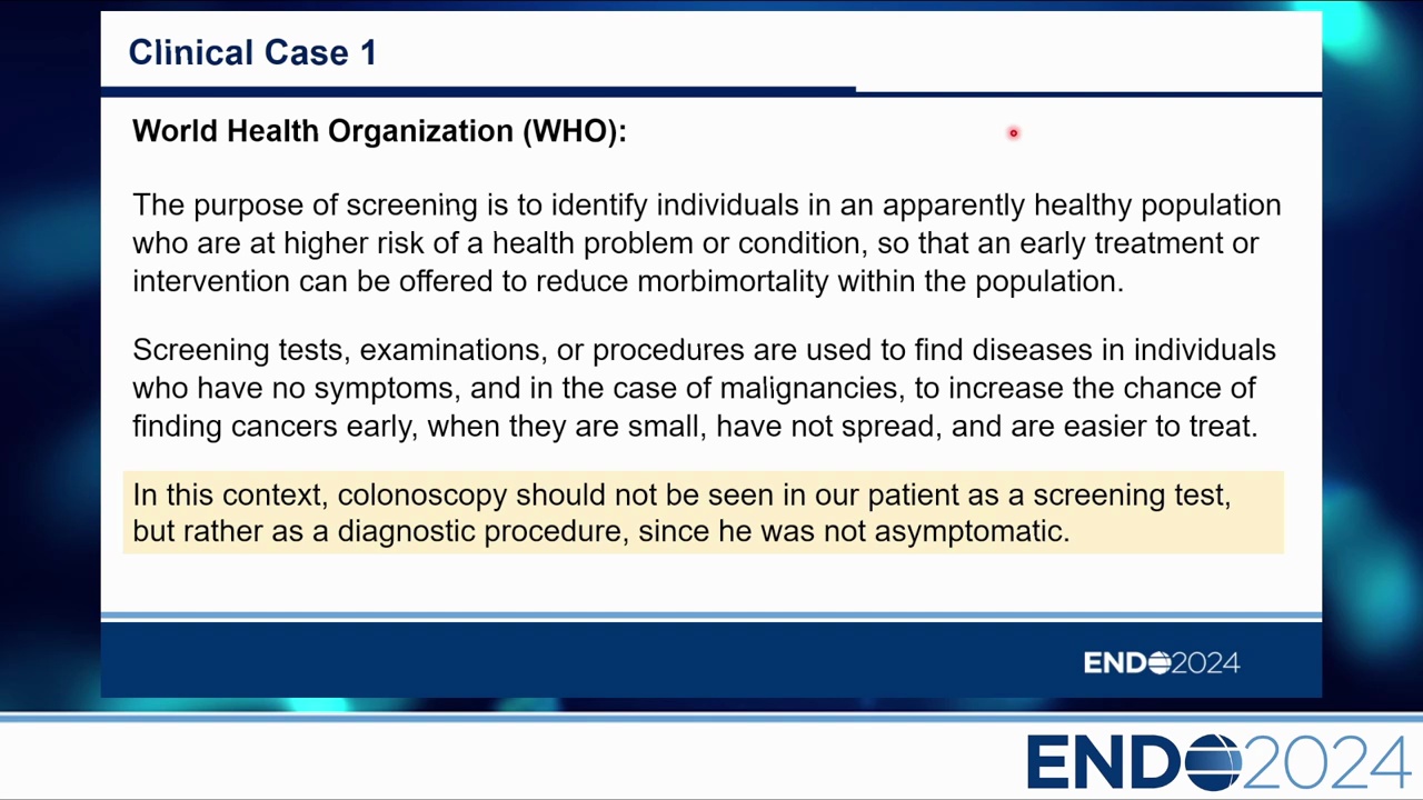 Slides 延伸補充:臨床案例 1 解析 (32歲男性) 案例描述:32 歲肢端肥大症,有裡急後重 (Tenesmus) 和便血 (Hematochezia)。 關鍵點:此時進行大腸鏡檢查不屬於「篩檢 (Screening)」,因為患者是有症狀的 (Symptomatic)。這是診斷性程序。因此,無論年齡或指引如何,都必須進行大腸鏡檢查。WHO 定義篩檢是針對「無症狀的健康人群」。