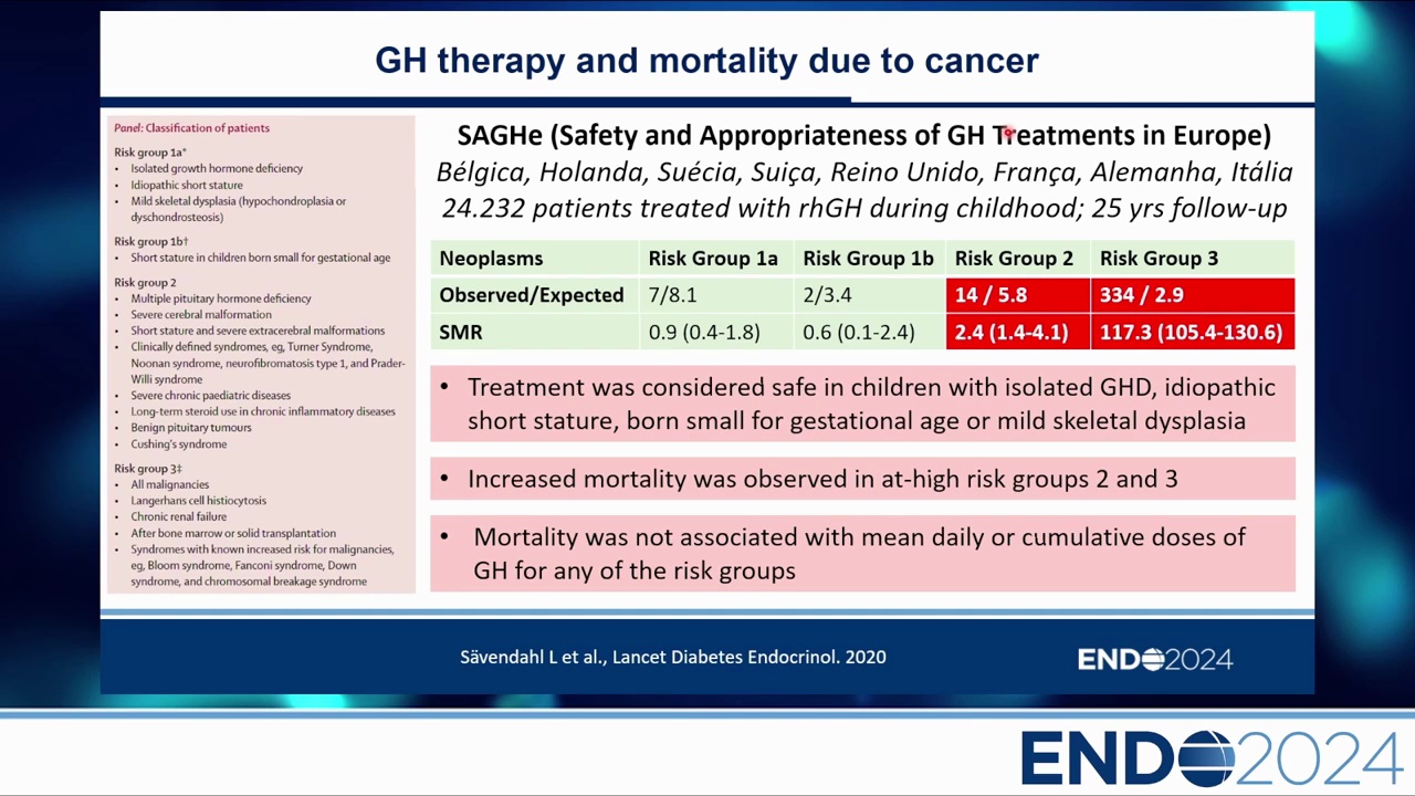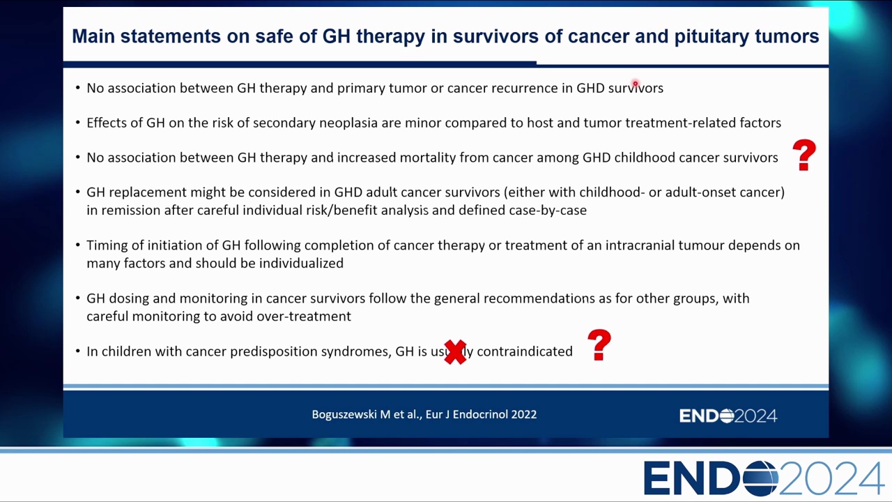 - 禁忌症:在具有癌症易感綜合症 (Cancer predisposition syndromes) 的兒童中,GH 通常是禁忌的(講者個人認為應絕對禁忌)。