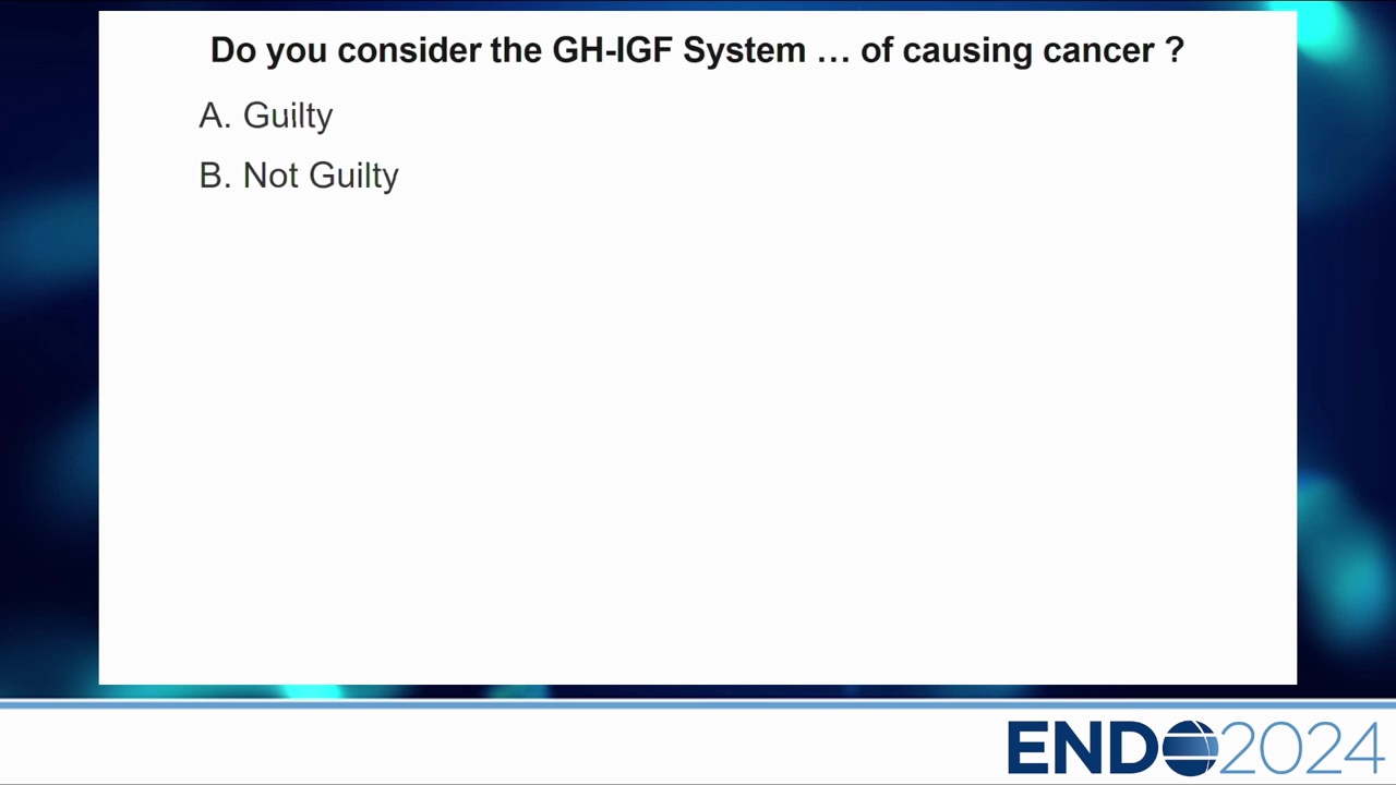 演講開始首先針對「生長激素(GH)與 IGF-1 系統是否為導致癌症的元兇(Guilty or Not Guilty)?」進行現場投票。初步結果顯示,約 71% 的聽眾認為「無罪(Not Guilty)」,僅 29% 認為有罪。
