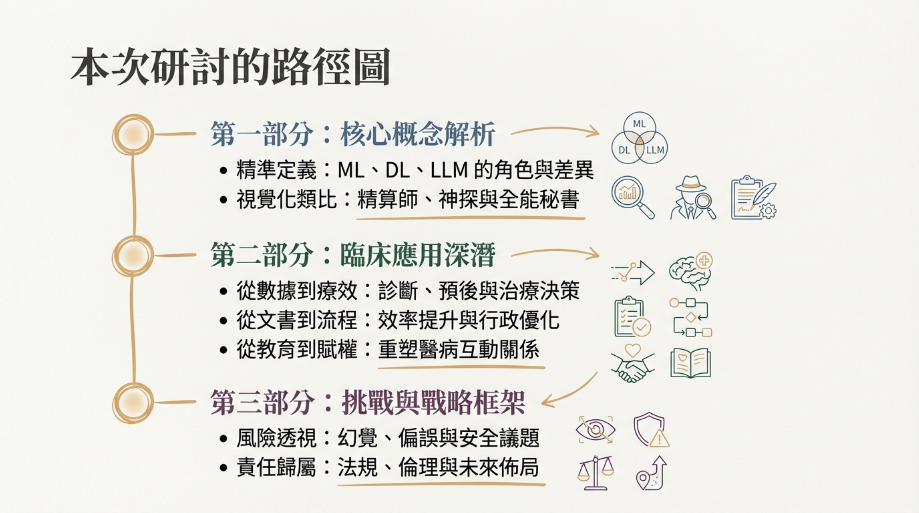 - LLM(全能秘書): 處理文本與對話,負責語言理解與生成。 理解這些分工,我們才能在臨床上「對症下藥」,選用正確的 AI 工具。