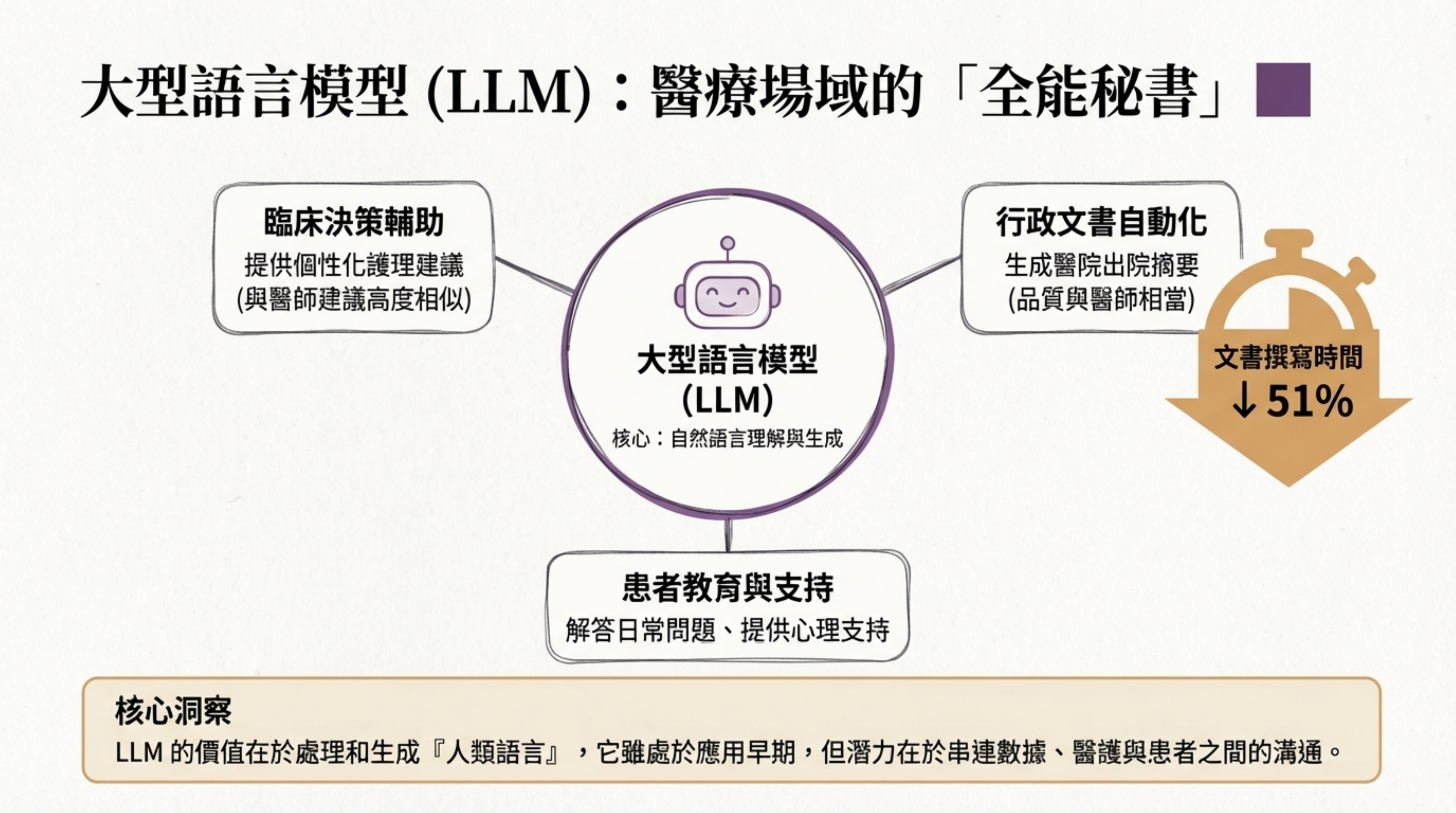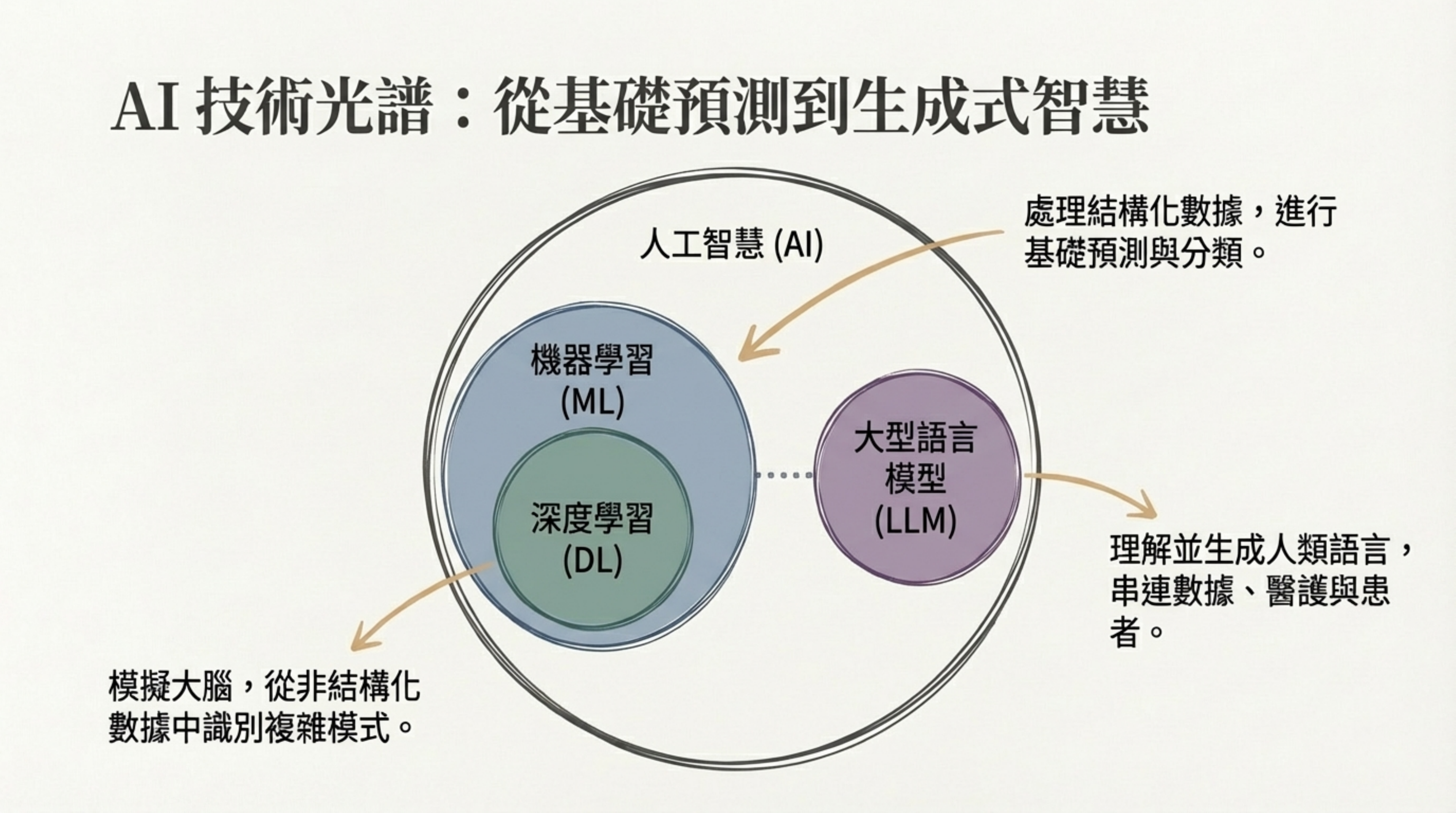 - 大型語言模型 (LLM): 最新的突破,它具備理解並生成人類語言的能力,是串連數據、醫護與患者的橋樑。