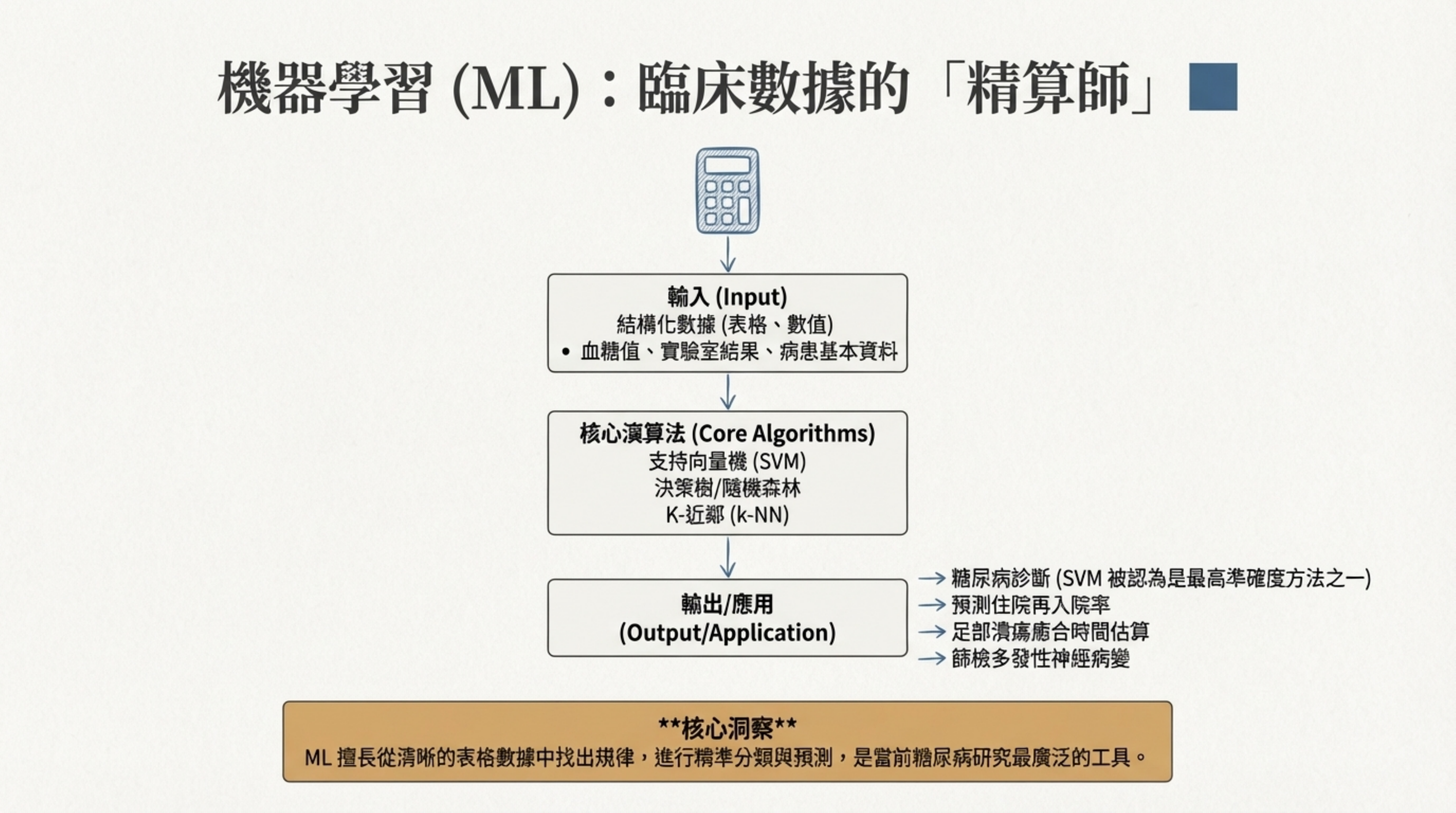 - 運作機制: 輸入結構化的表格數據(如血糖值、實驗室結果、病患基本資料),透過核心演算法(如支持向量機 SVM、隨機森林)進行運算。