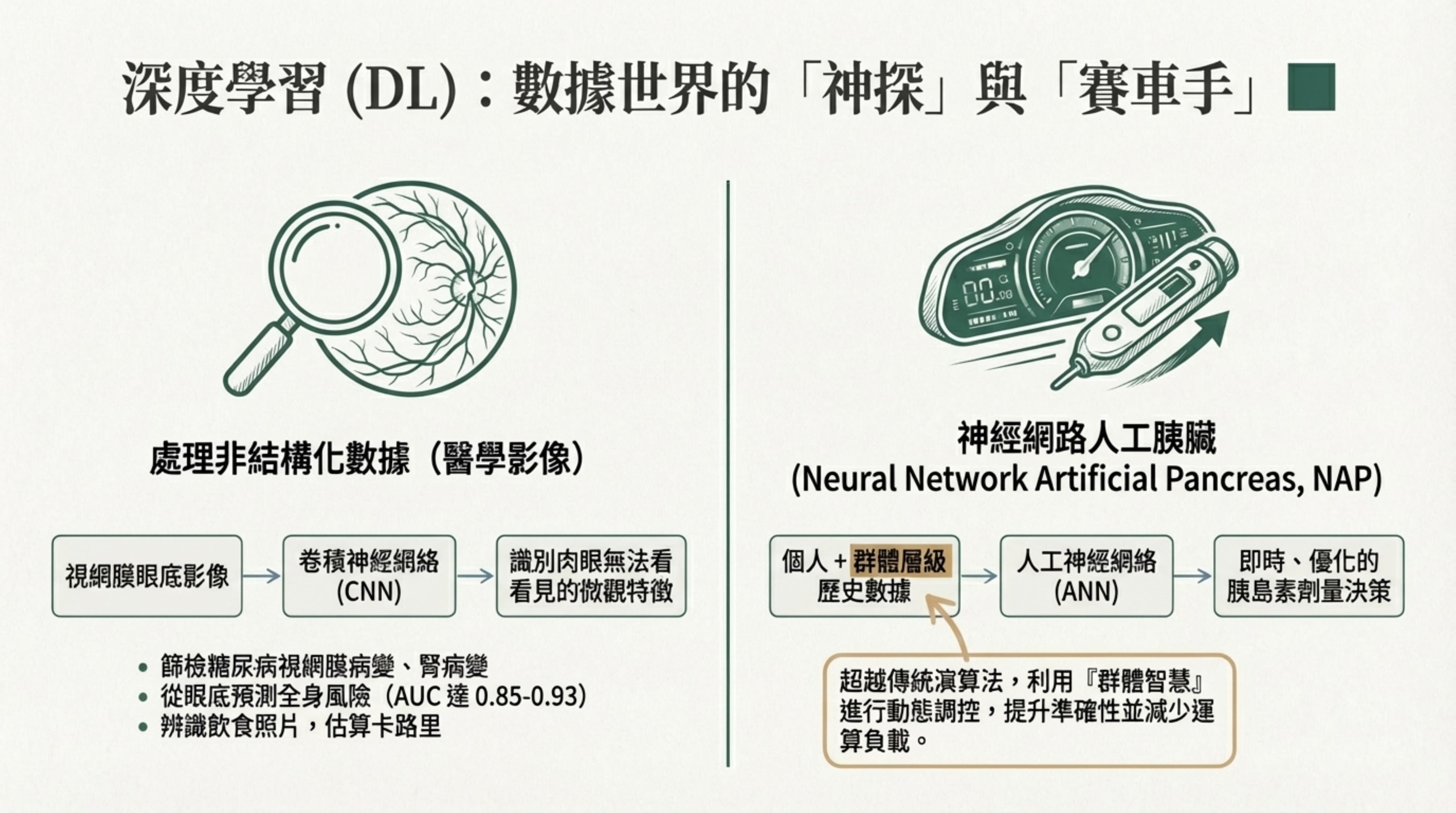 - 視覺辨識(神探): 在處理非結構化影像數據上,DL 使用卷積神經網絡 (CNN) 來識別肉眼難以察覺的微觀特徵。例如在糖尿病視網膜病變 (DR) 的篩檢中,能從眼底預測全身風險(AUC 達 0.85-0.93)。