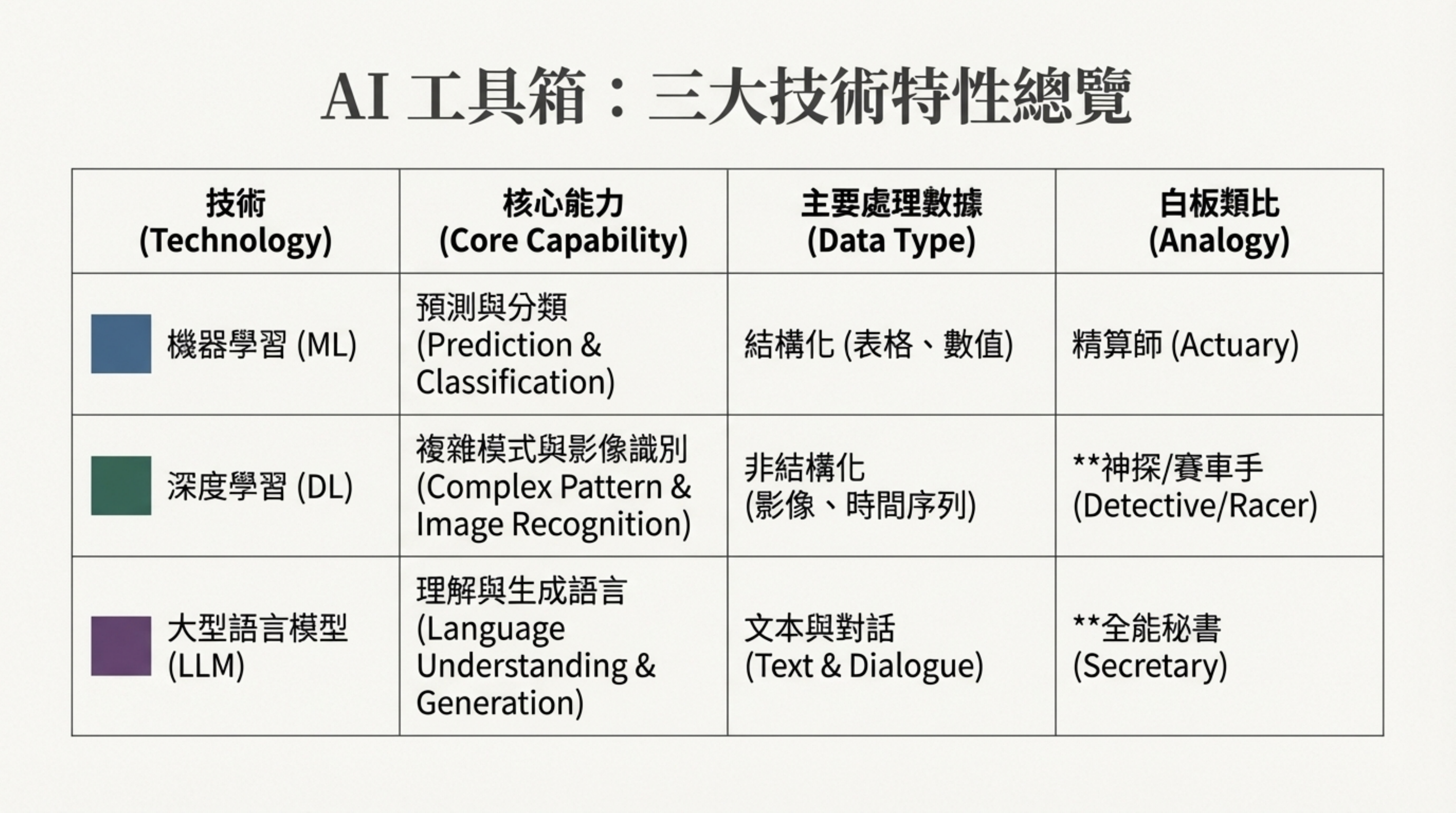 - 核心概念解析: 釐清 ML(機器學習)、DL(深度學習)與 LLM(大型語言模型)的技術邊界與角色差異。