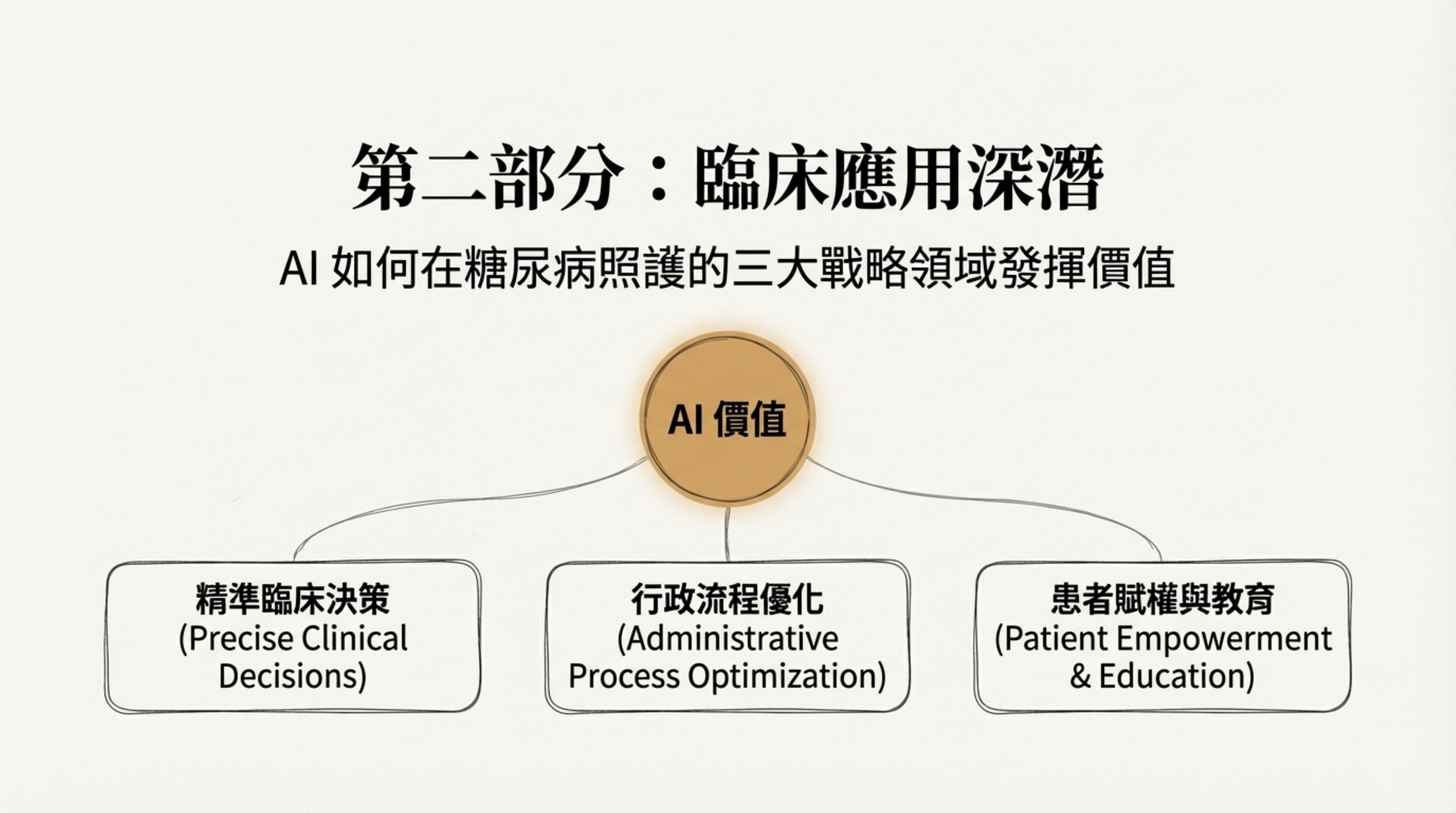 說明: 接下來我們進入實戰應用,探討 AI 如何在「精準臨床決策」、「行政流程優化」與「患者賦權與教育」這三個維度上創造實際價值。