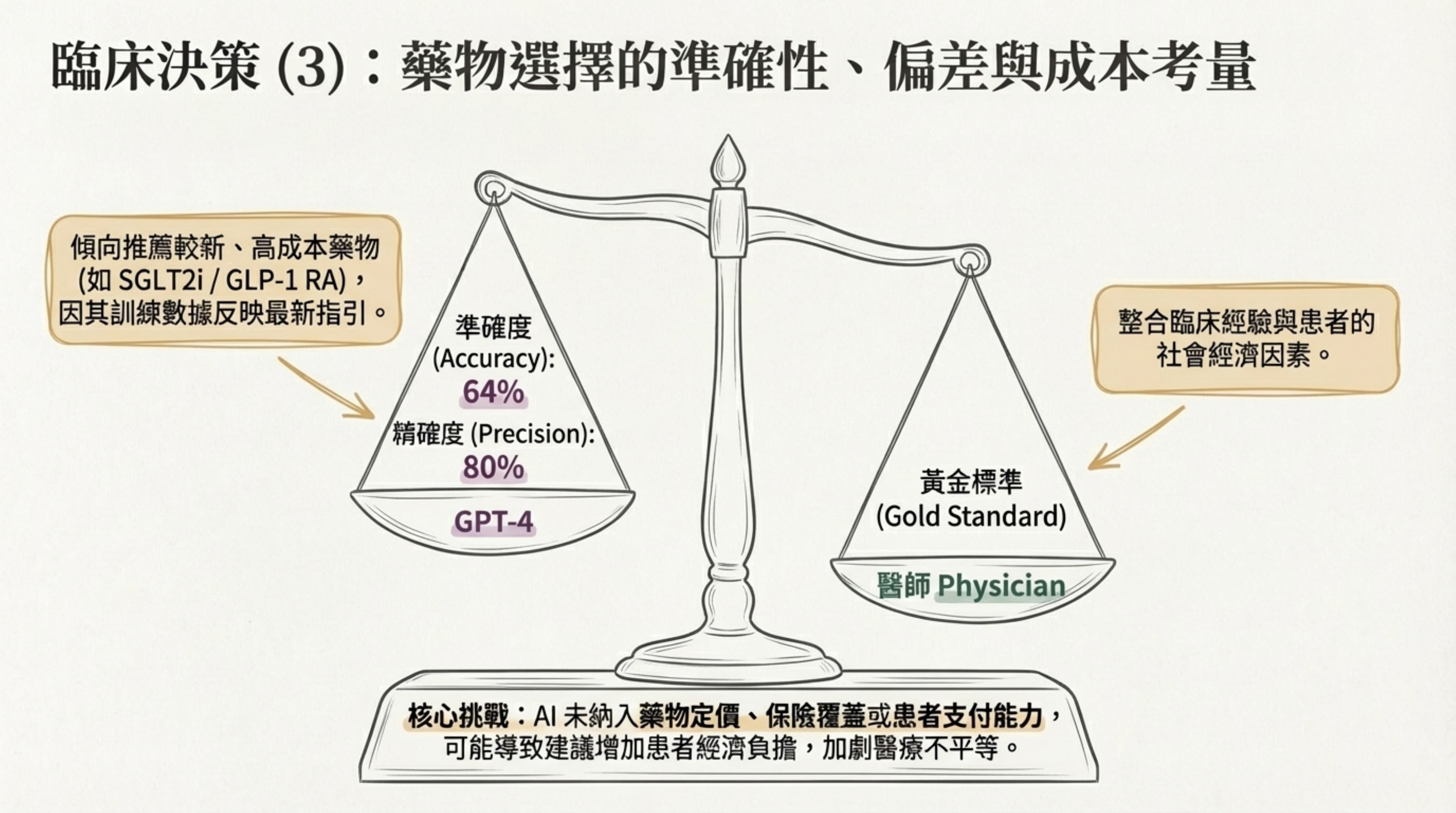 - 成本偏差 (Cost Bias): 然而,AI 存在「富貴病」。它傾向推薦符合最新指引的高成本藥物(如 SGLT2i, GLP-1 RA),而推薦傳統藥物 Metformin 的頻率略低於醫師(25% vs 31%)。