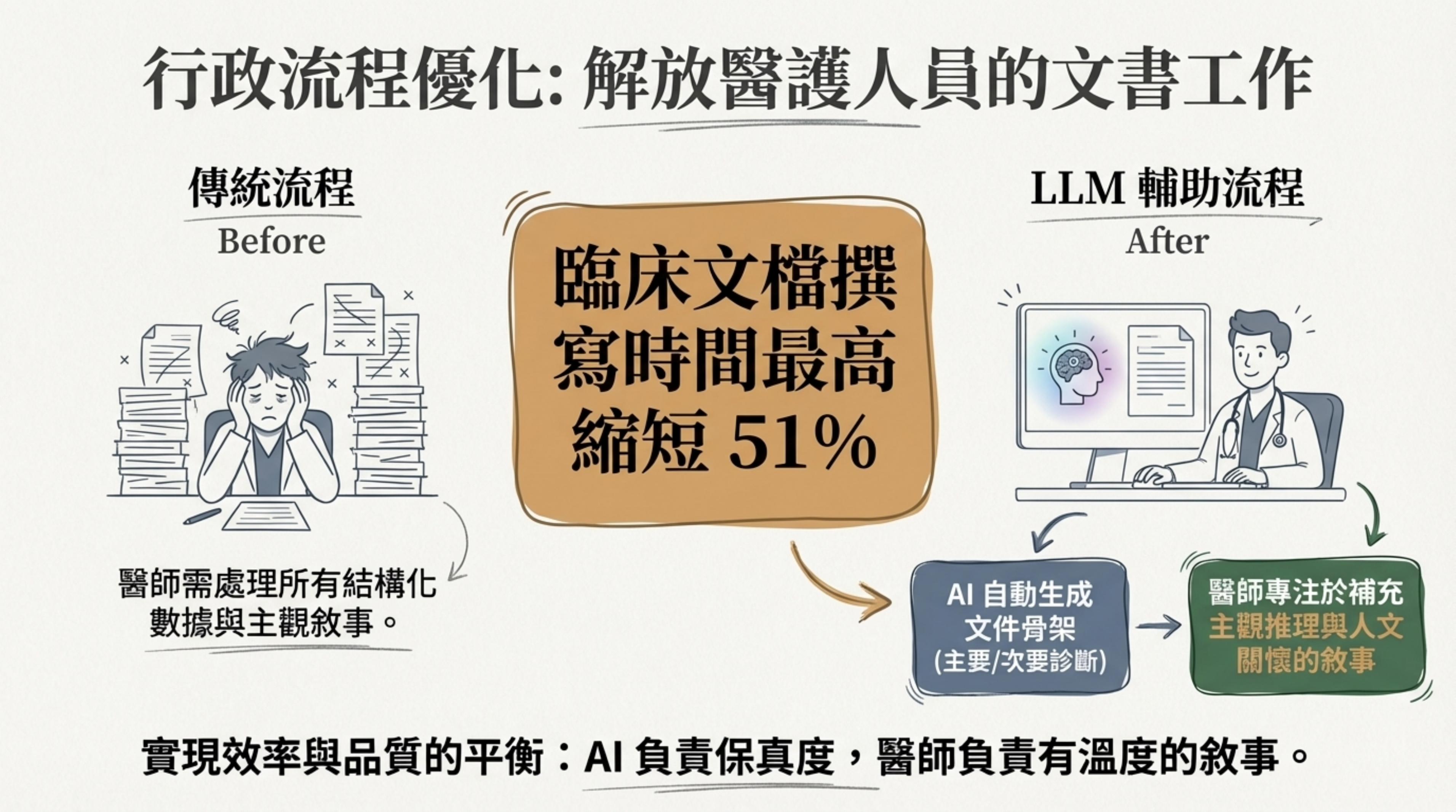 - 行政文書自動化: 生成出院摘要,品質與醫師相當,並能將文書撰寫時間縮短高達 51%。