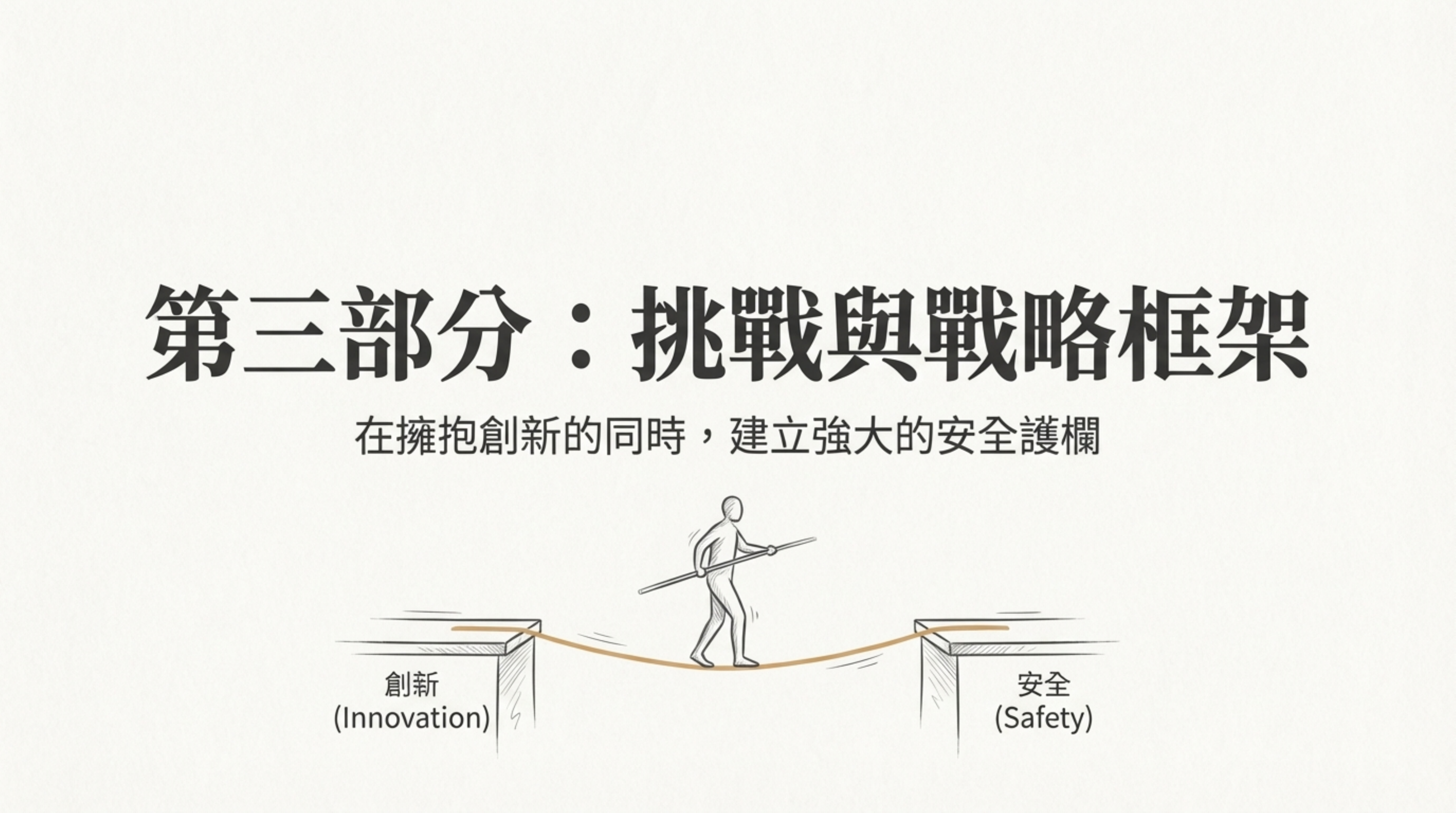 說明: 最後,我們不能只看優點。要成功部署 AI,必須正視其內在風險與外部挑戰。
