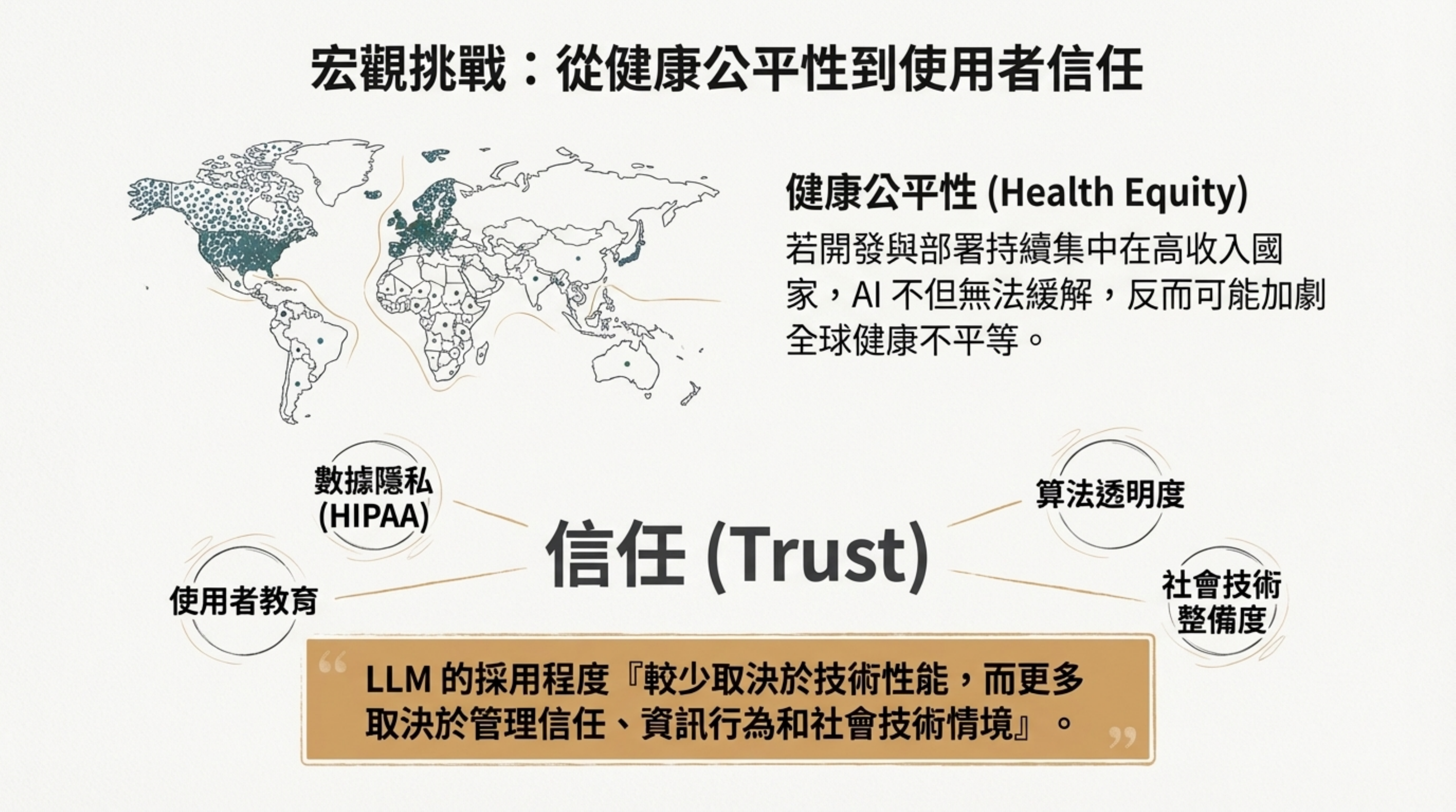 Slide 16: 宏觀挑戰:從健康公平性到使用者信任
