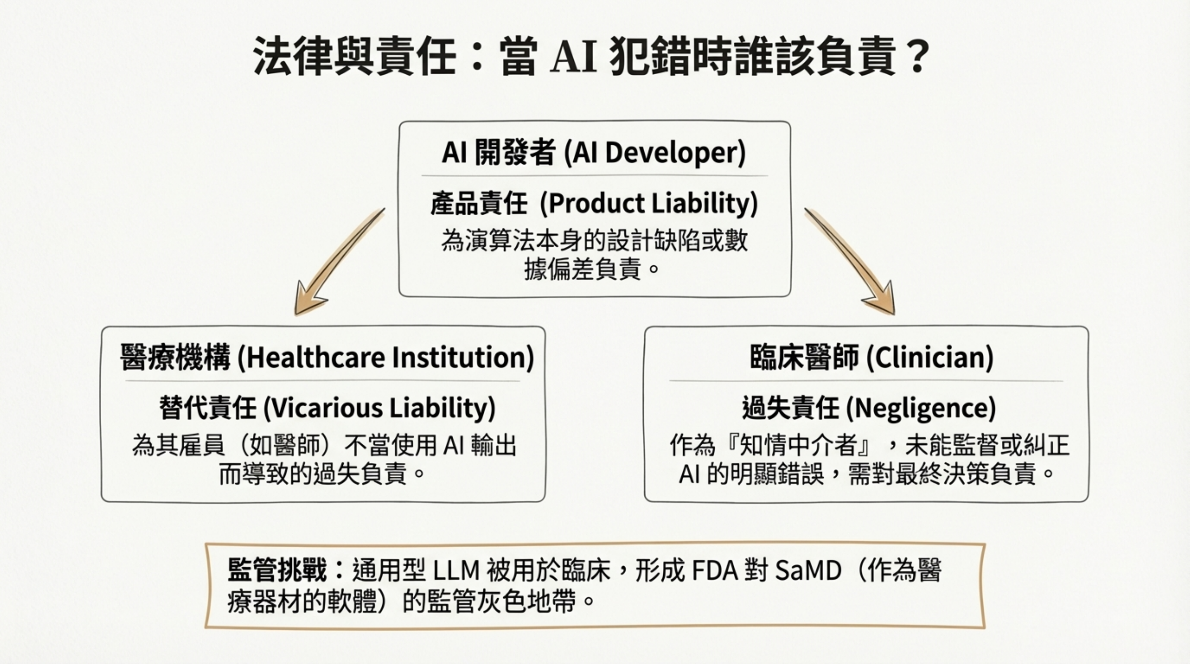 - 臨床醫師: 承擔過失責任。醫師是「知情中介者」,若未能監督糾正 AI 的明顯錯誤,需對最終決策負責。