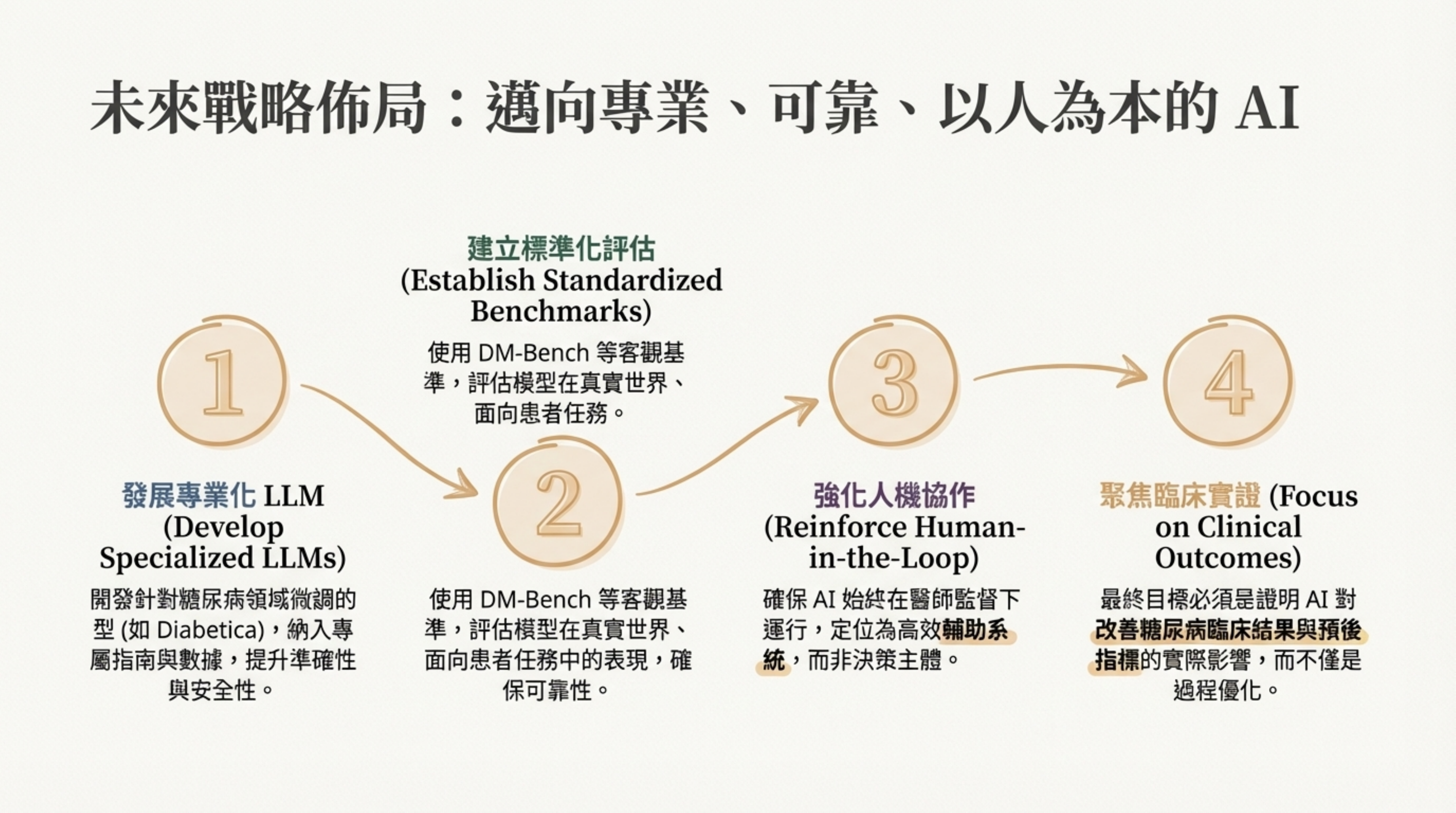 - 發展專業化 LLM: 使用針對糖尿病微調的模型(如 Diabetica),而非通用模型。