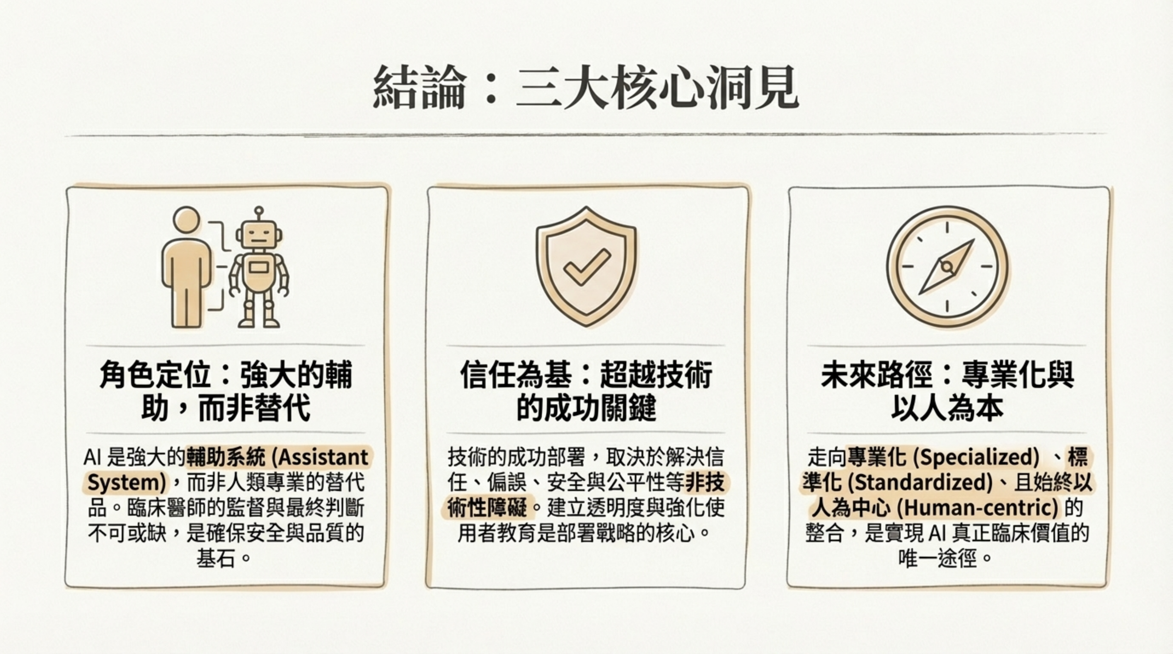 - 強化人機協作: 確保 AI 始終在醫師監督下運行 (Human-in-the-loop)。