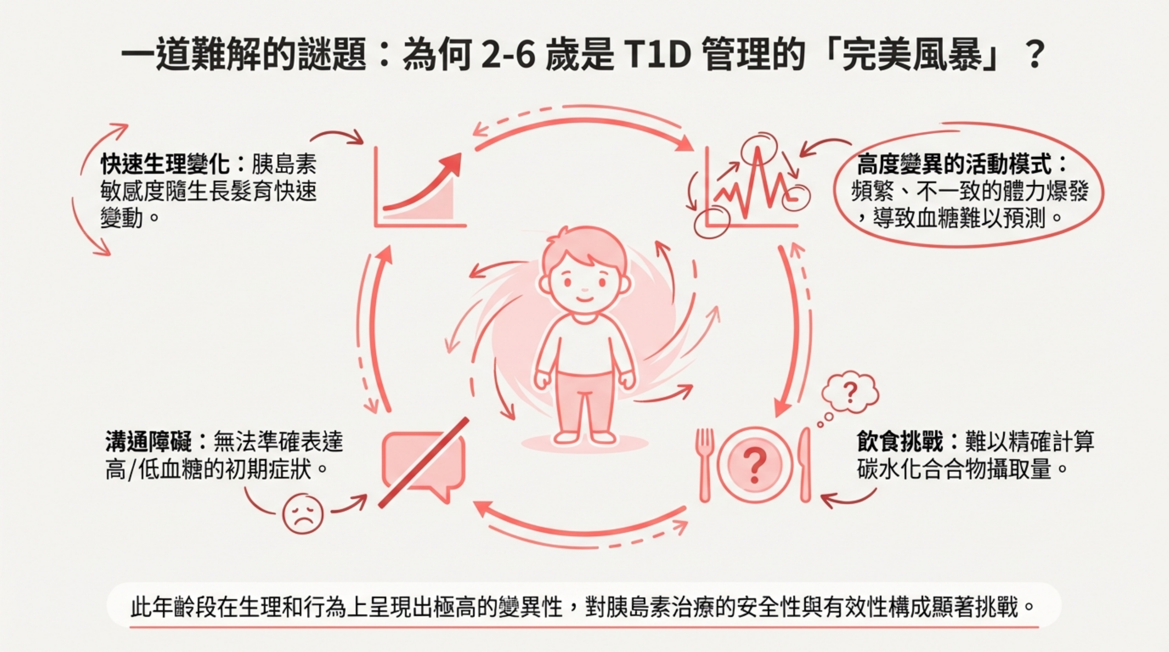 說明: 這張投影片分析了 2-6 歲幼兒被視為 T1D 管理中「最困難群體」的四大原因,形成了一場管理的「完美風暴」 :