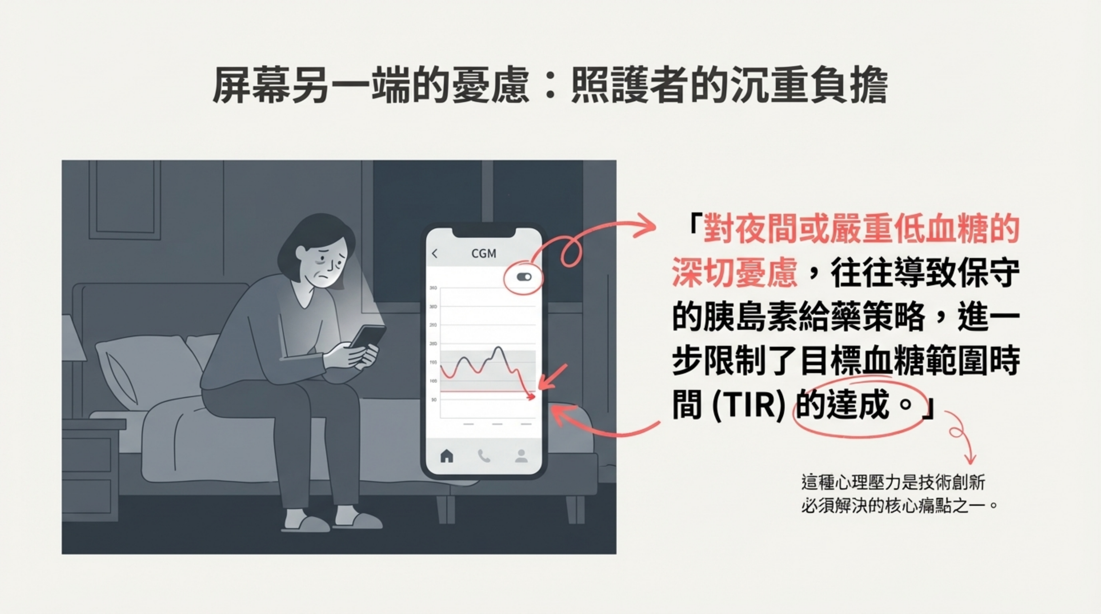 這張圖強調了技術背後的人性痛點: 父母對低血糖的深切恐懼 由於幼兒無法在夜間表達低血糖症狀,父母往往採取「防禦性」的治療策略,例如故意讓血糖維持在較高水平,或減少夜間基礎胰島素劑量 。這種心理壓力導致了保守的給藥策略,雖然避免了低血糖,卻直接限制了「目標血糖範圍時間(TIR)」的達成,使得血糖控制長期處於次優狀態 。這也是技術創新必須解決的核心痛點——不僅要控制血糖,還要減輕照護者的心理負擔。