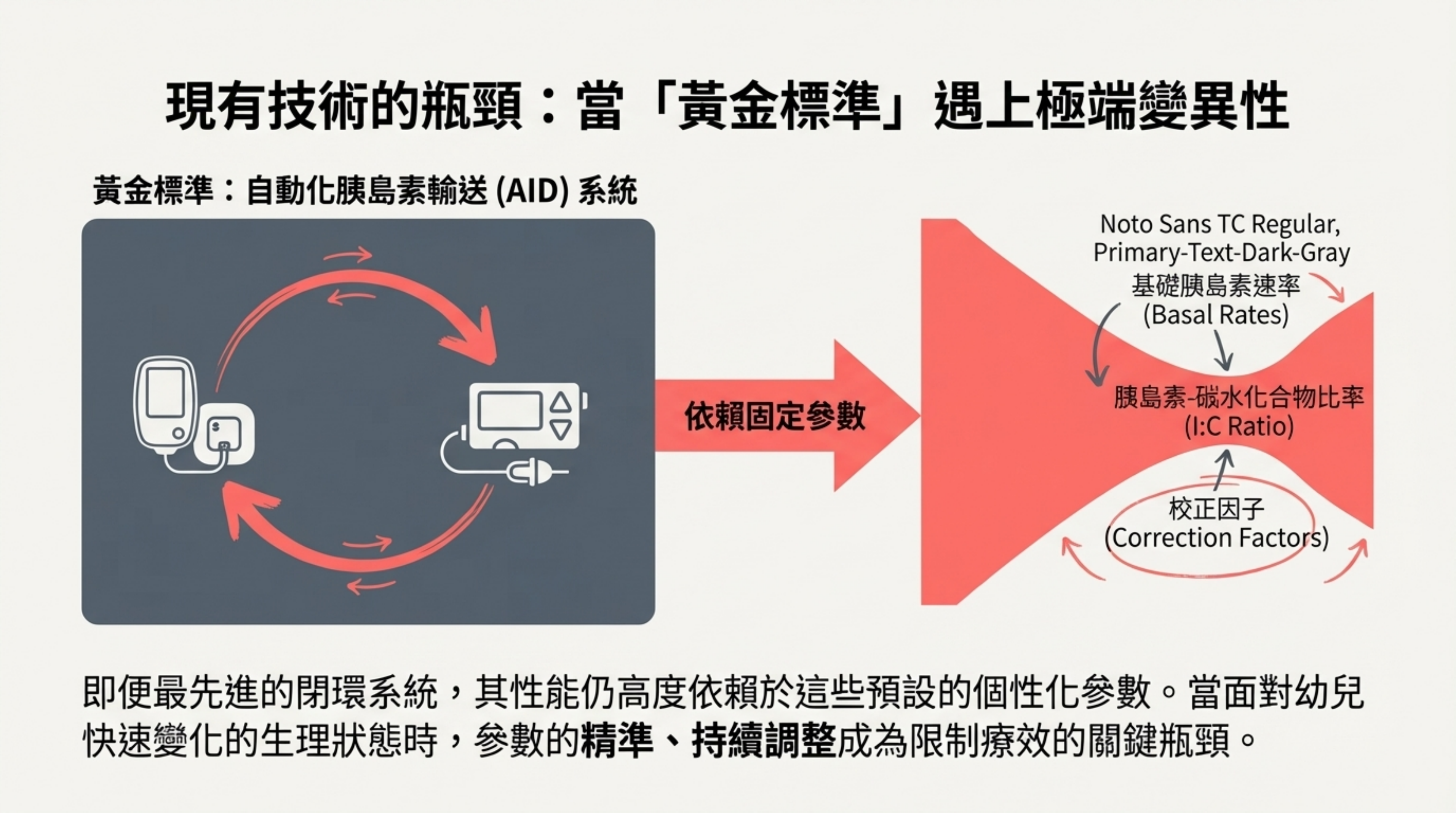基礎胰島素速率(Basal Rates) 胰島素-碳水化合物比率(I:C Ratio) 校正因子(Correction Factors) 對於生理狀態穩定的成人,這些參數可能只需偶爾調整。但對於 2-6 歲幼兒,其生理參數變化極快,導致這些預設參數經常「失準」。當基礎參數不準確時,AID 系統的自動調節能力也會受限,這就是現有技術在兒科應用上的關鍵瓶頸 。