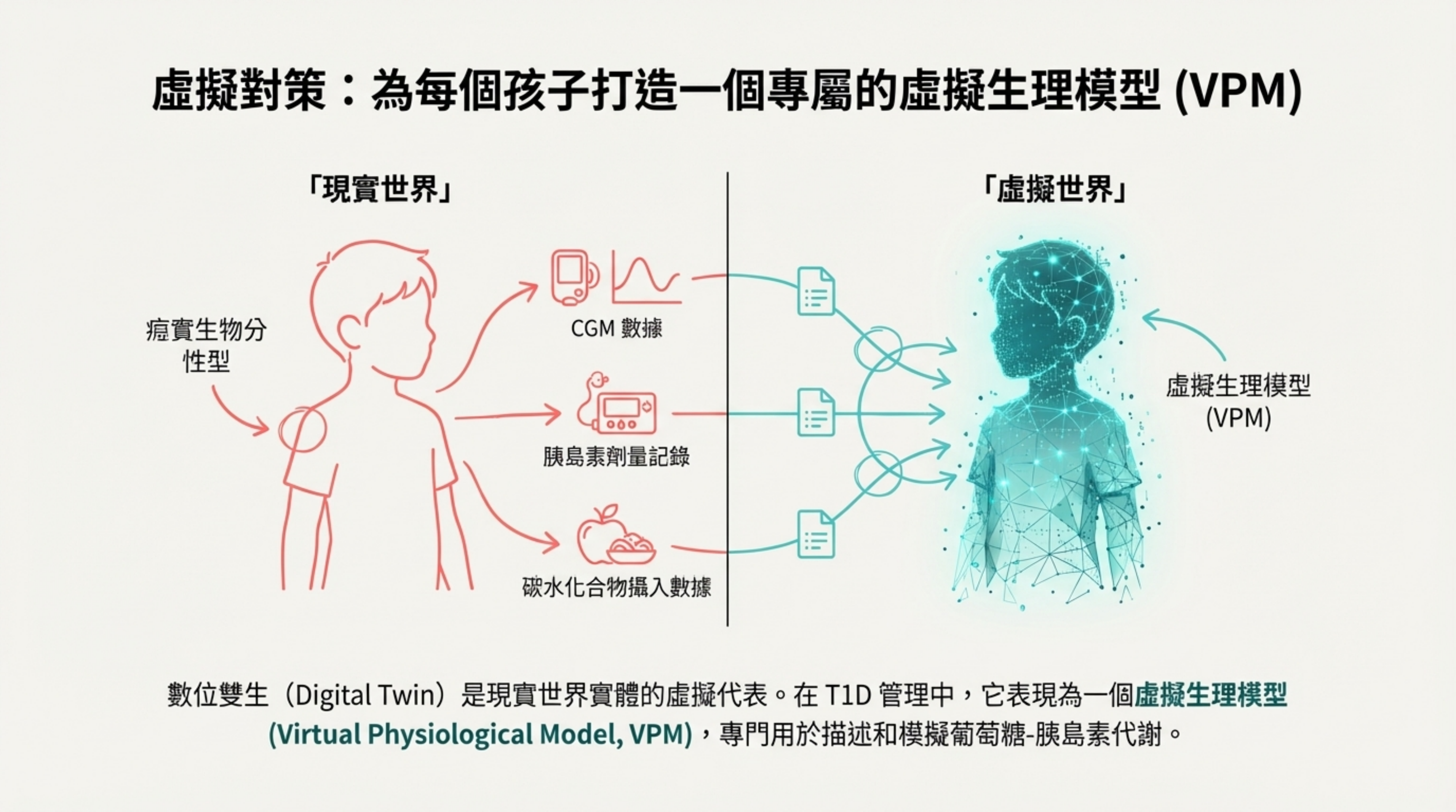 說明: 這張投影片定義了醫療領域的「數位雙生」。在 T1D 管理中,數位雙生並非外觀上的 3D 虛擬人,而是一個虛擬生理模型(Virtual Physiological Model, VPM) 。