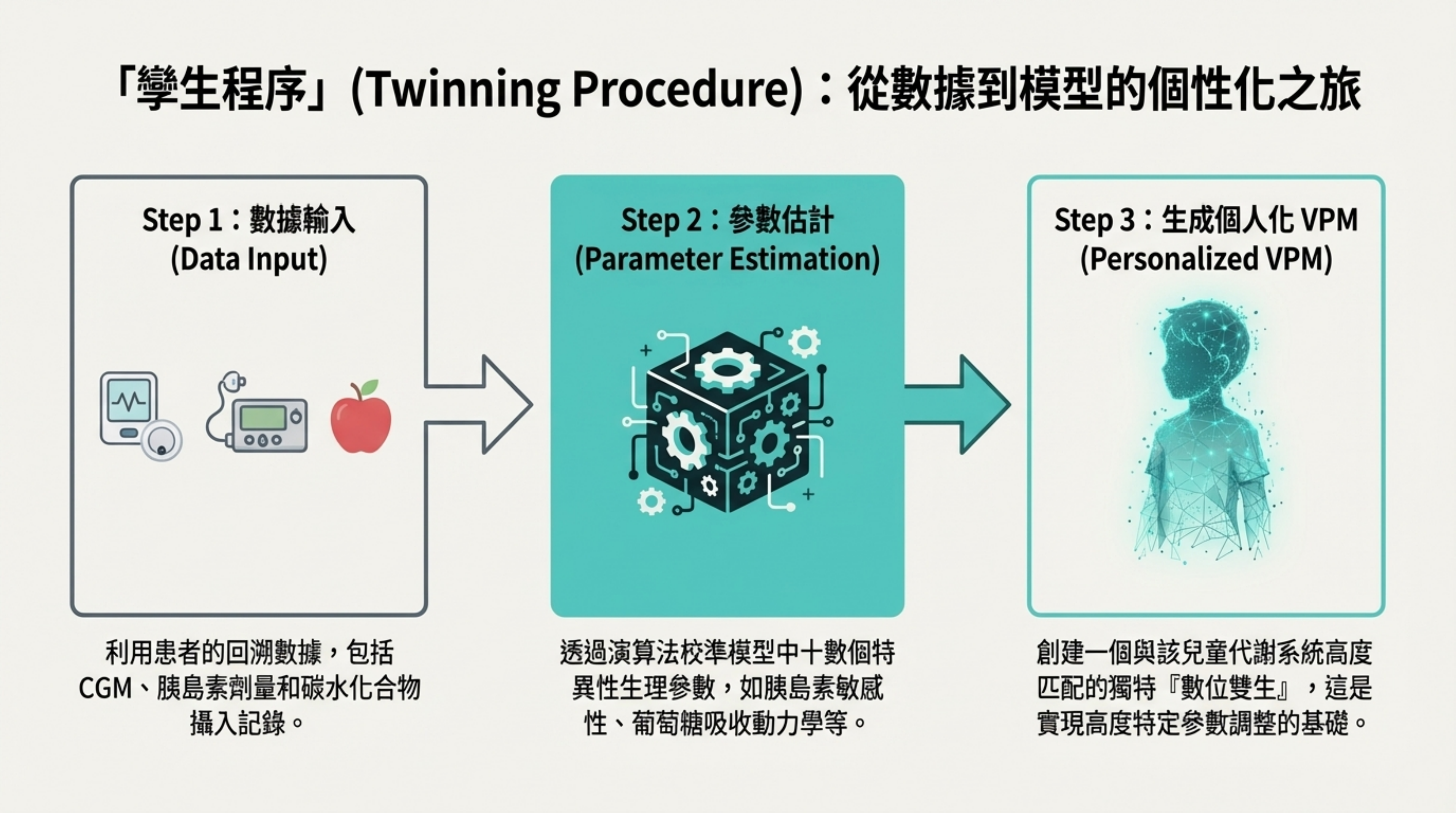 Step 3 生成個人化 VPM (Personalized VPM):產出一個能精確模仿該名兒童代謝反應的數位模型。這是後續進行高精度參數調整的基礎 。