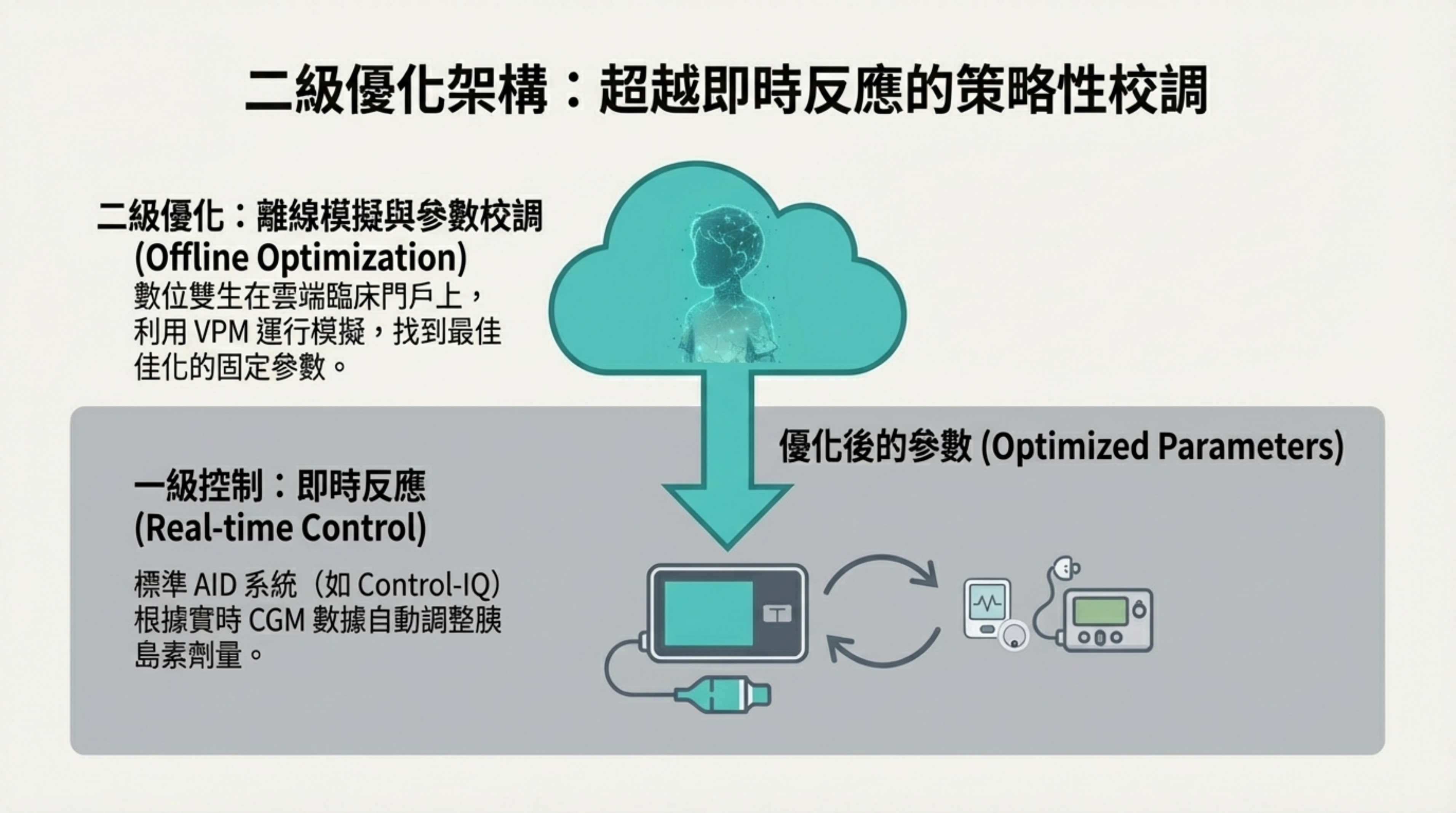 一級控制(下層,灰色區):這是標準的 AID 系統(如 Control-IQ),負責即時反應 (Real-time Control),根據當下的 CGM 數值微調胰島素 。