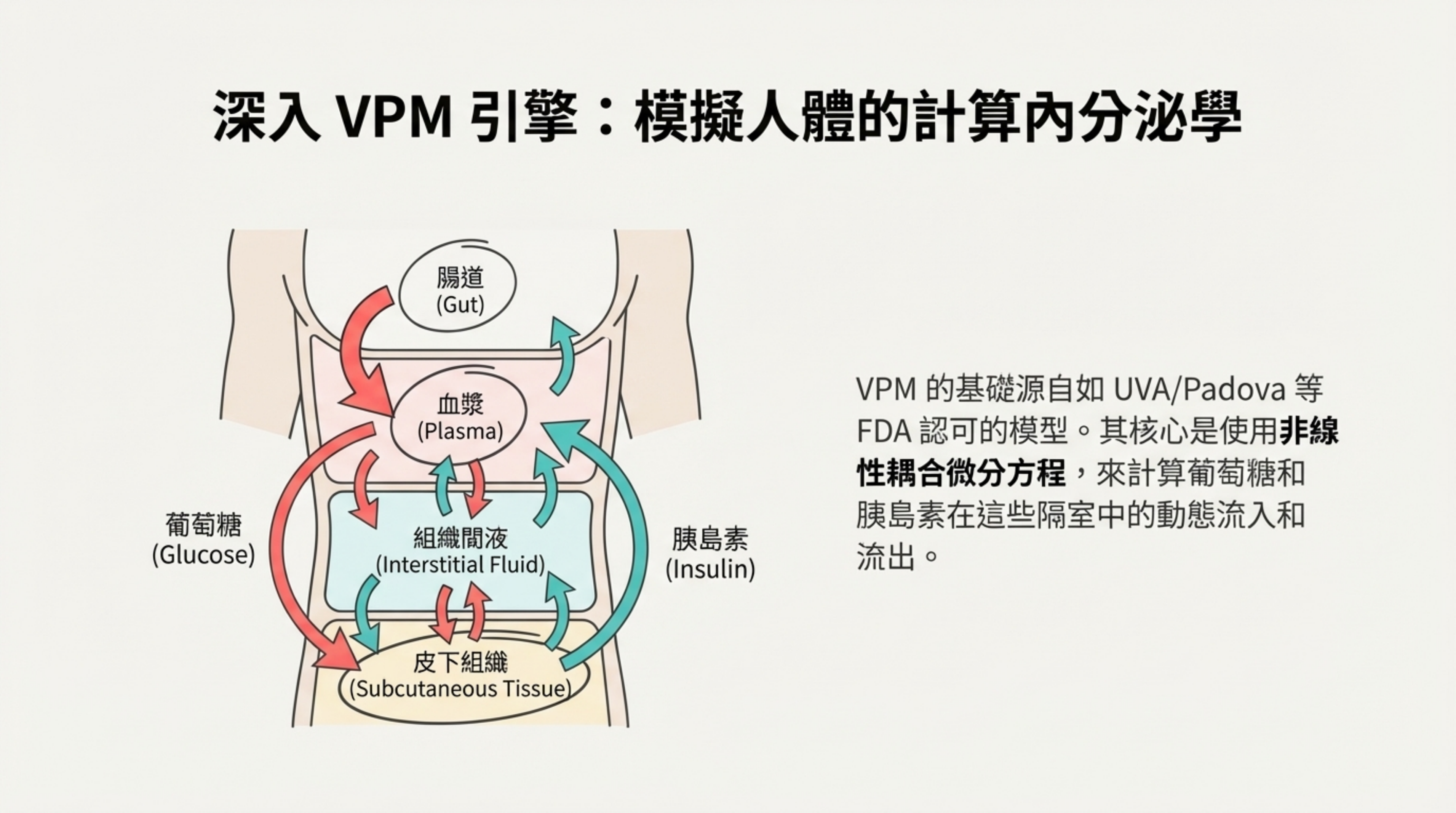 說明: 解構 VPM 的內部運作機制,基於 UVA/Padova 模型 。 圖示展示了模型將人體劃分為不同的隔室(Compartments):