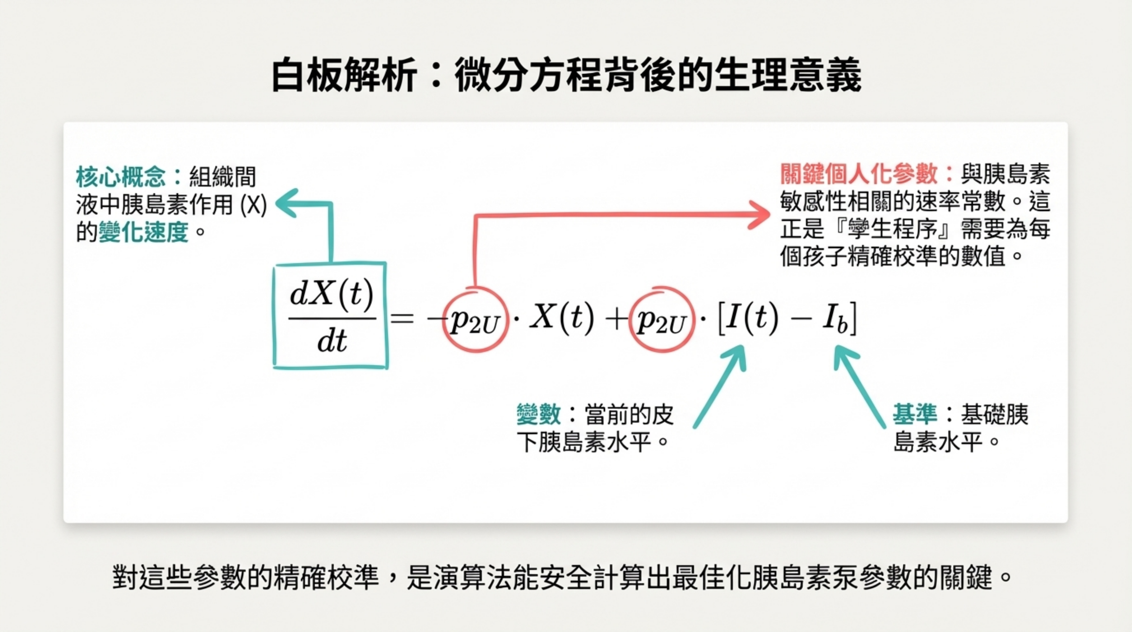 ** (紅色圈):這是關鍵的個人化參數,代表胰島素敏感性**相關的速率常數。這正是「孿生程序」需要為每個孩子精確校準的數值。幼兒的 變異極大,是參數優化的重點 。