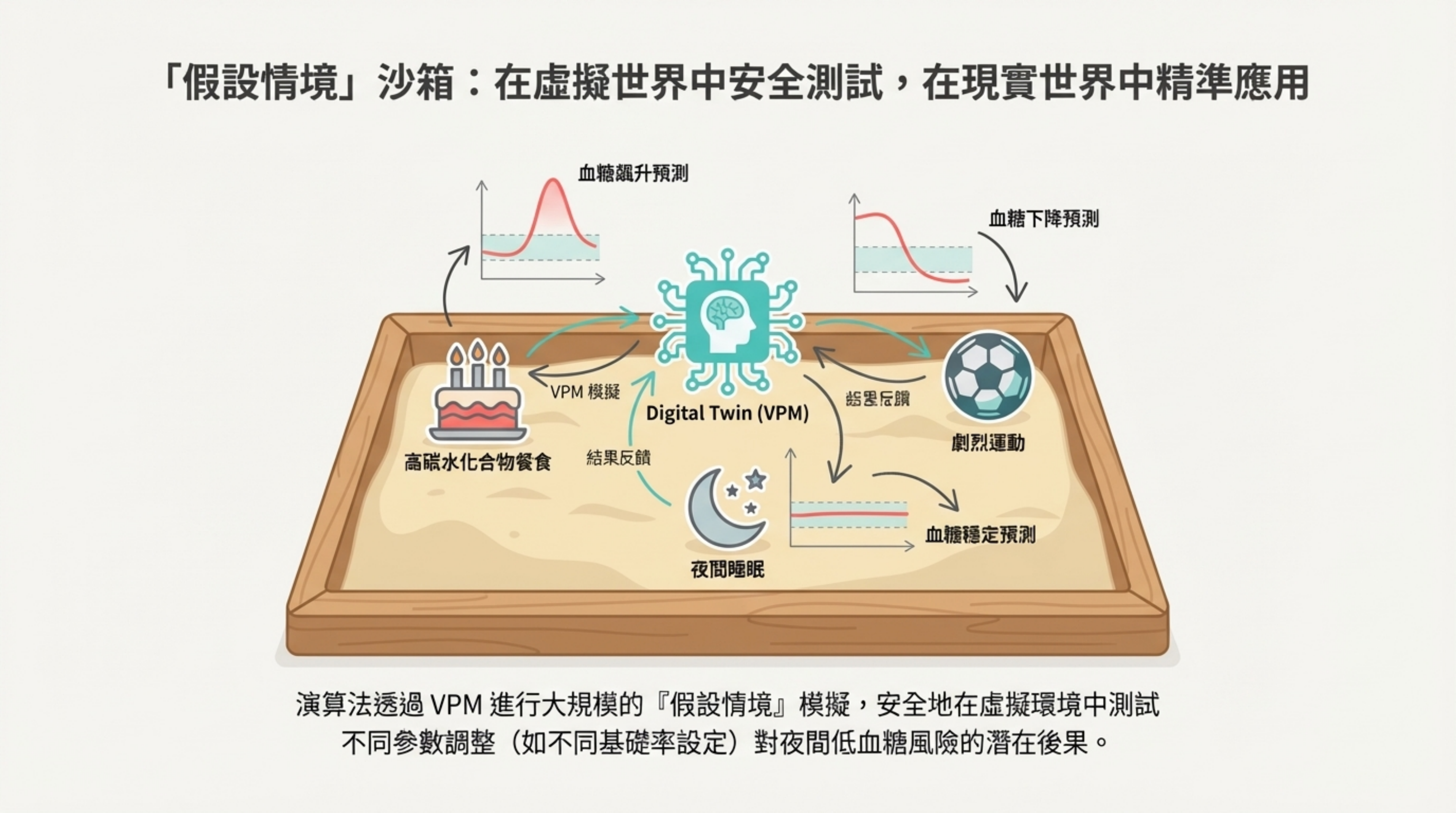 高碳水化合物大餐(生日蛋糕):測試 I:C 比率是否足夠? 夜間睡眠:測試基礎率是否會導致清晨低血糖? 劇烈運動:模擬踢球後的血糖驟降。 這種大規模的離線模擬允許系統預測不同參數設定的潛在後果(如低血糖風險),從而選擇最安全的一組參數。這解決了臨床上「不敢亂調參數」的安全顧慮 。