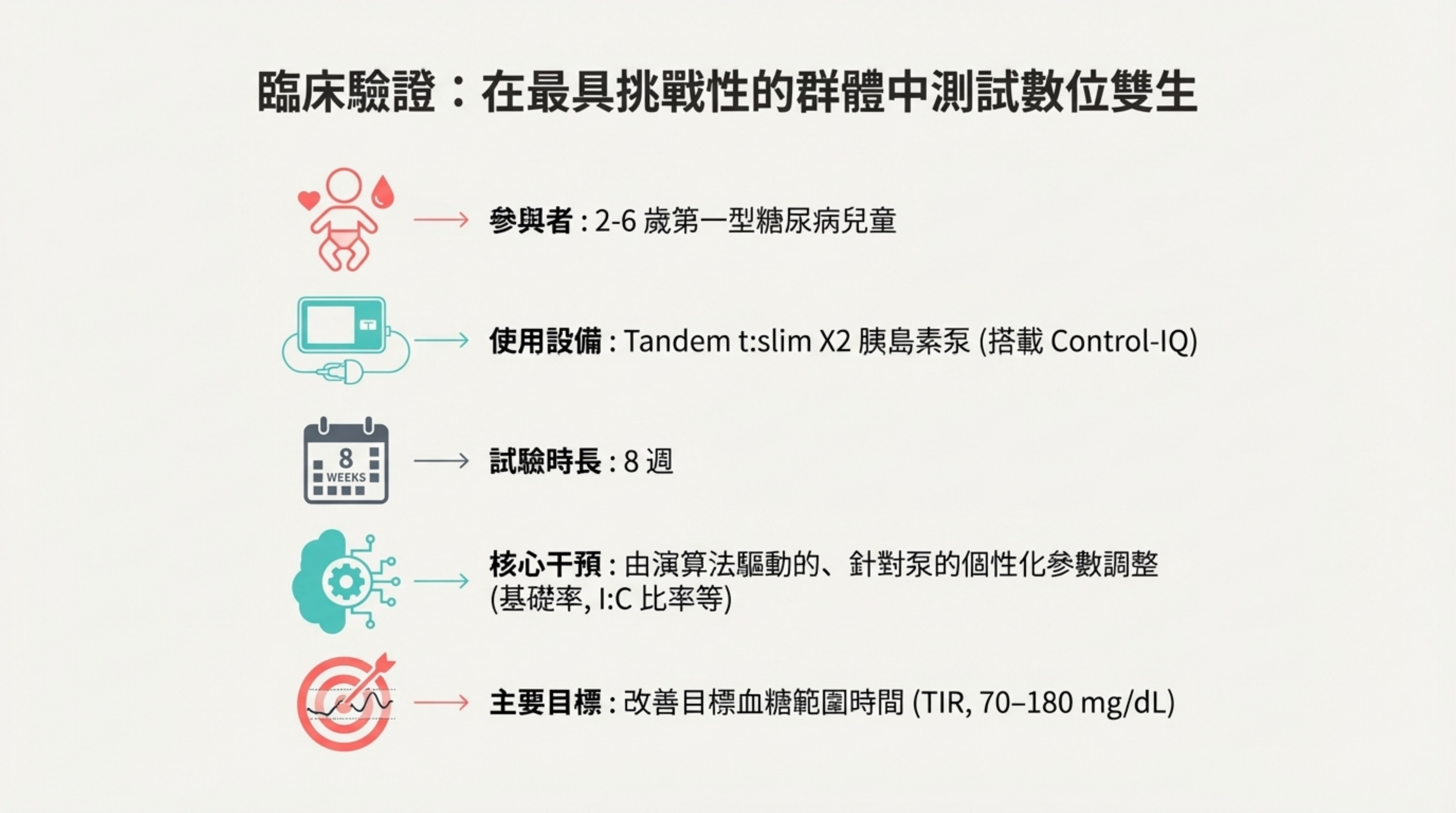 參與者:2-6 歲的第一型糖尿病兒童(最難控制的群體)。 設備:Tandem t:slim X2 胰島素泵(搭載 Control-IQ)。 時長:8 週。 核心干預:由 VPM 演算法驅動的、針對泵的個性化參數調整(每兩週一次)。 主要目標:改善目標血糖範圍時間(TIR, 70-180 mg/dL)。
