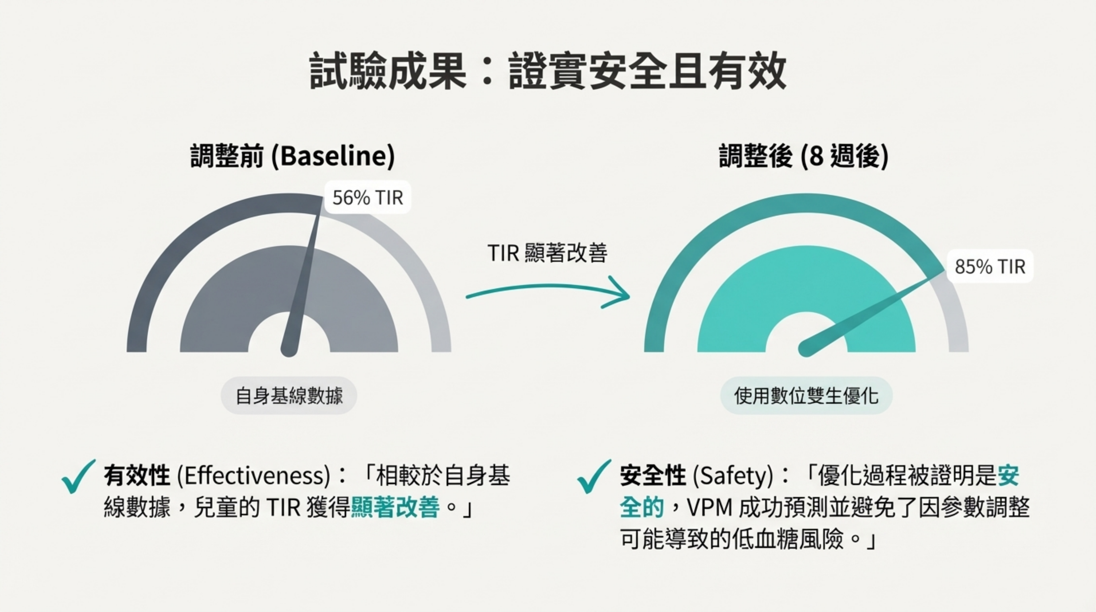 安全性 (Safety):最重要的是,優化過程被證明是安全的。VPM 成功預測並避免了因參數調整可能導致的低血糖風險,這對於幼兒群體至關重要 。