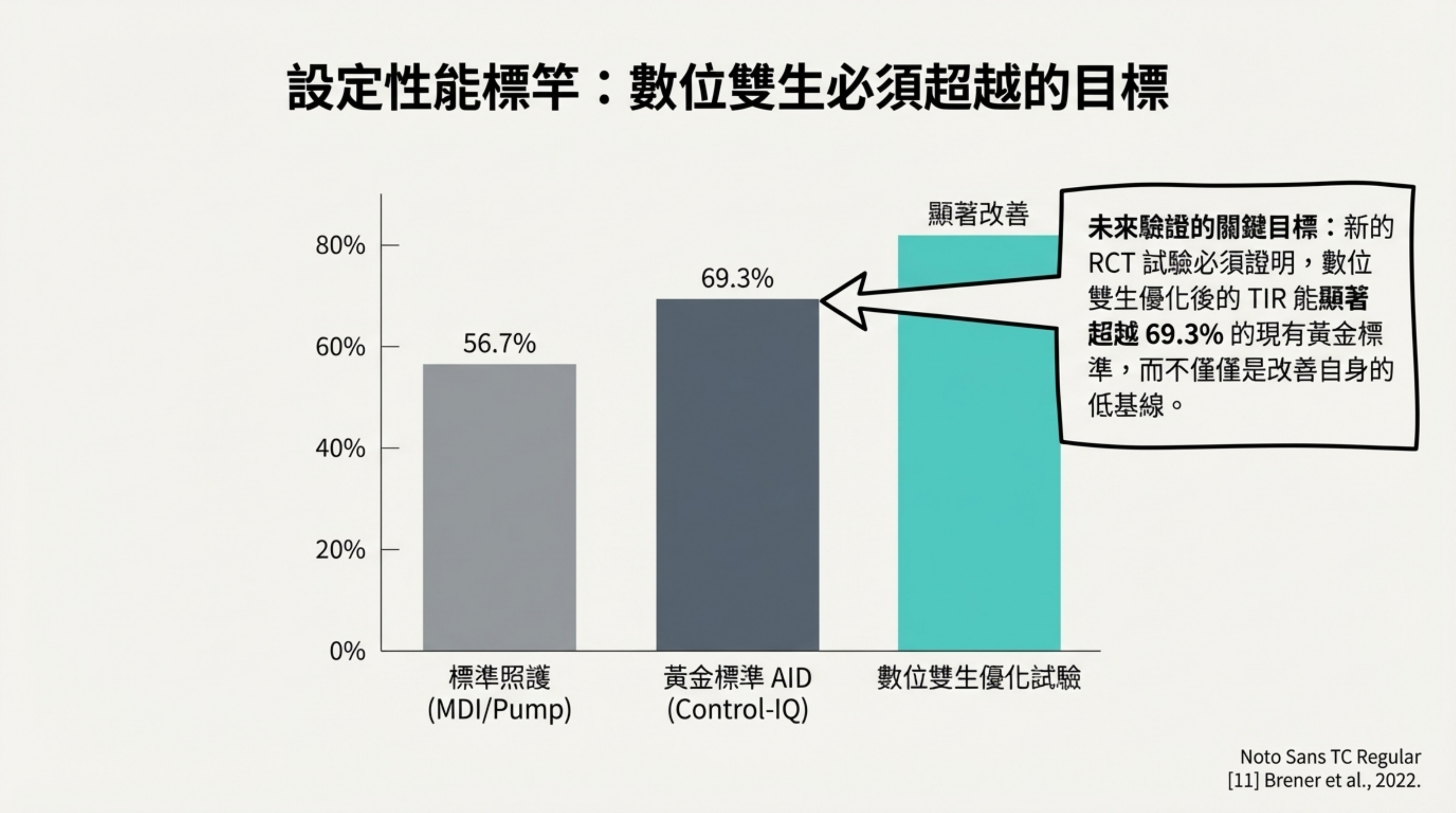 數位雙生優化:必須證明能顯著超越 69.3%。 這張圖強調,未來的 RCT 試驗必須證明數位雙生能帶來的邊際效益 (Incremental Efficacy),而不僅僅是改善低基線。