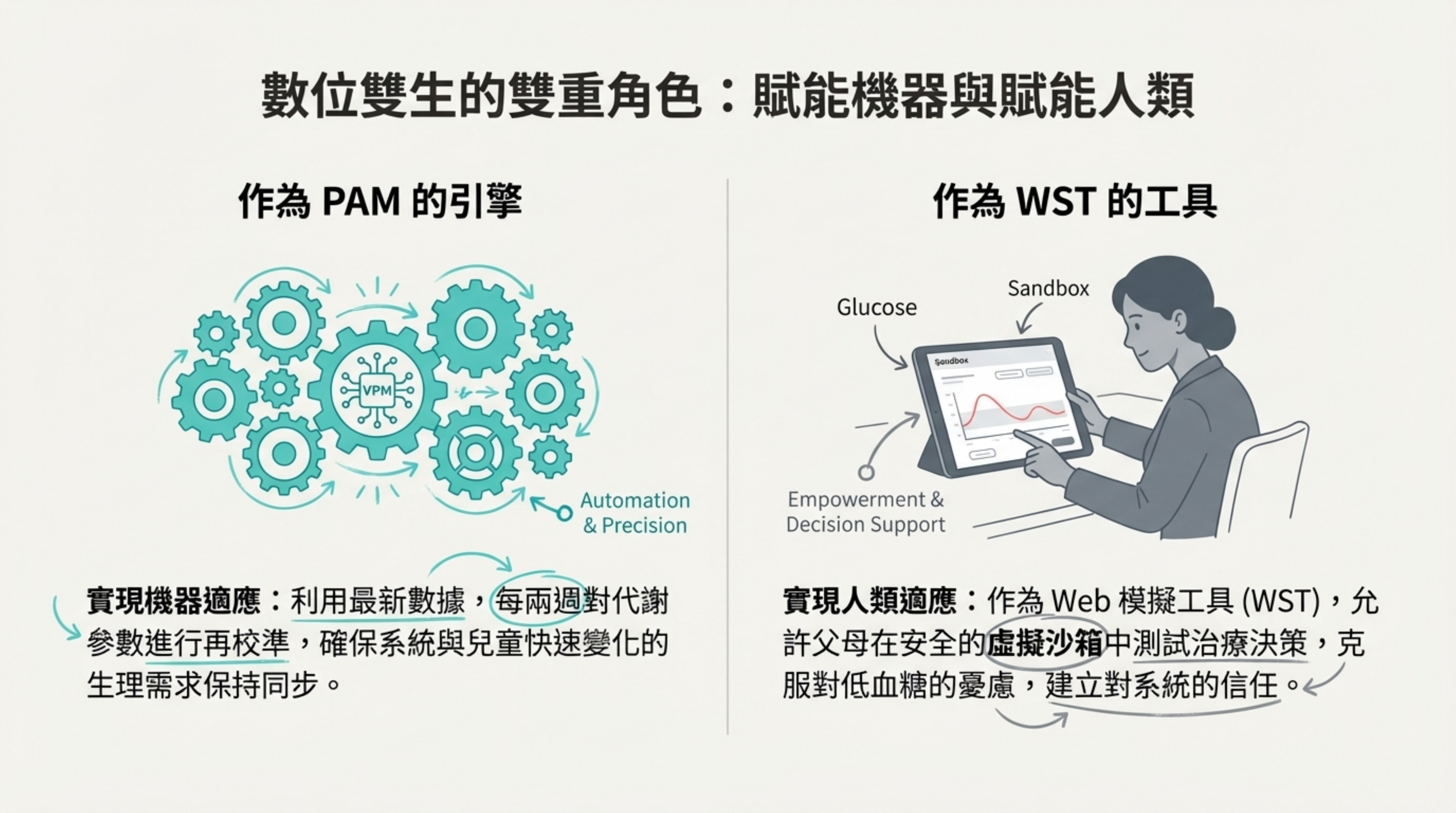- 功能:人類適應。提供資訊反饋(如 TIR 趨勢),並提供模擬工具,賦能照護者做出更好的治療決策。 兩者形成一個閉環,機器優化參數,人類優化行為。