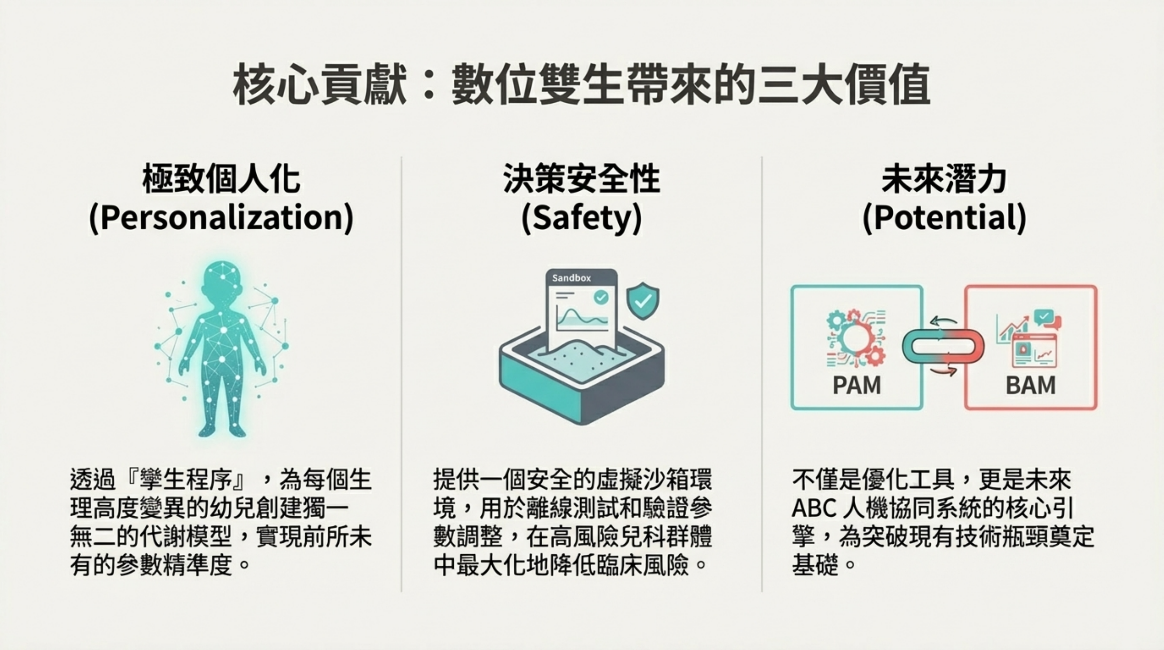 - 極致個人化 (Personalization):透過「孿生程序」,為每個代謝高度變異的幼兒創建獨一無二的模型,實現前所未有的參數精準度。