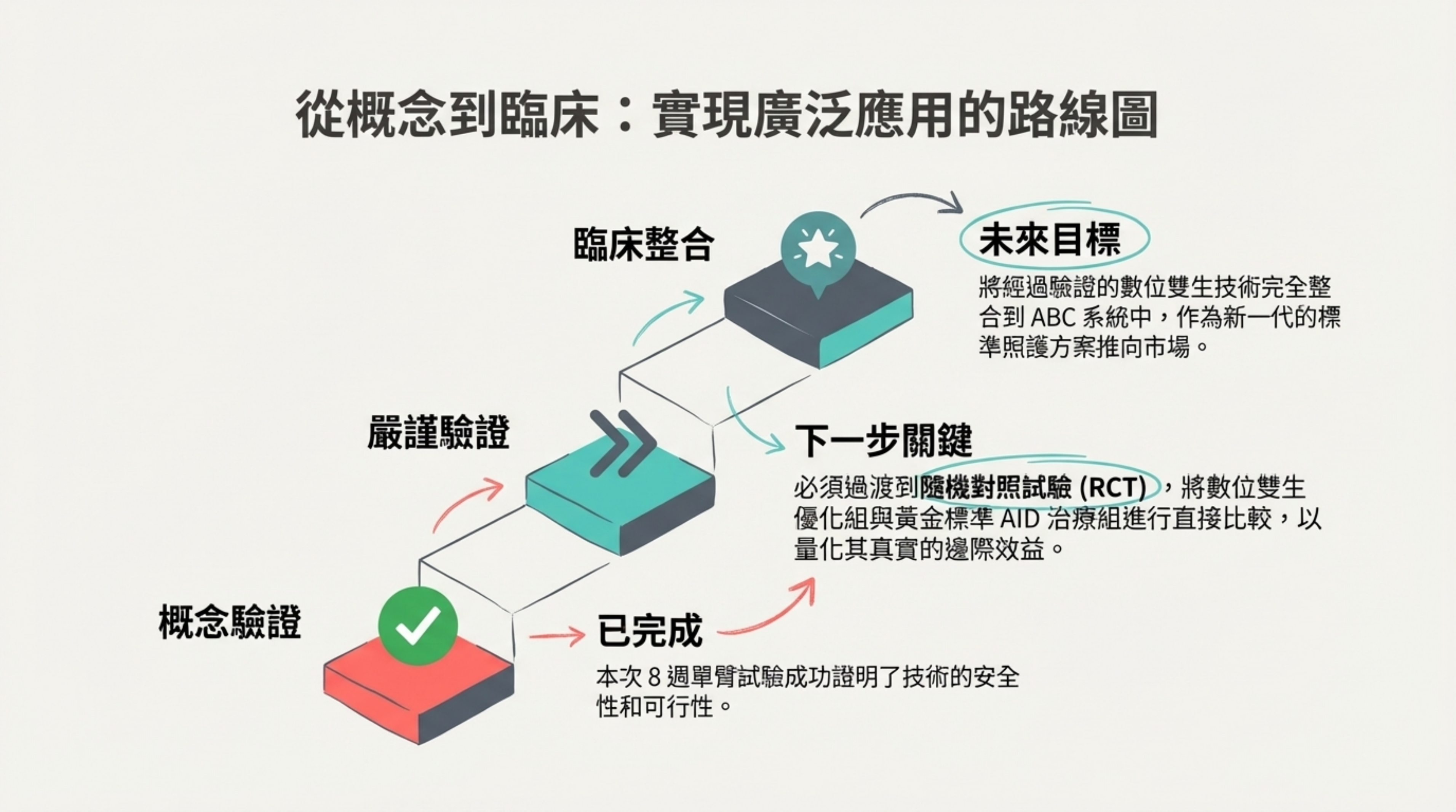 - 嚴謹驗證 (下一步關鍵):必須過渡到隨機對照試驗 (RCT),將數位雙生優化組與黃金標準 AID 治療組直接比較,以量化其真實的邊際效益。