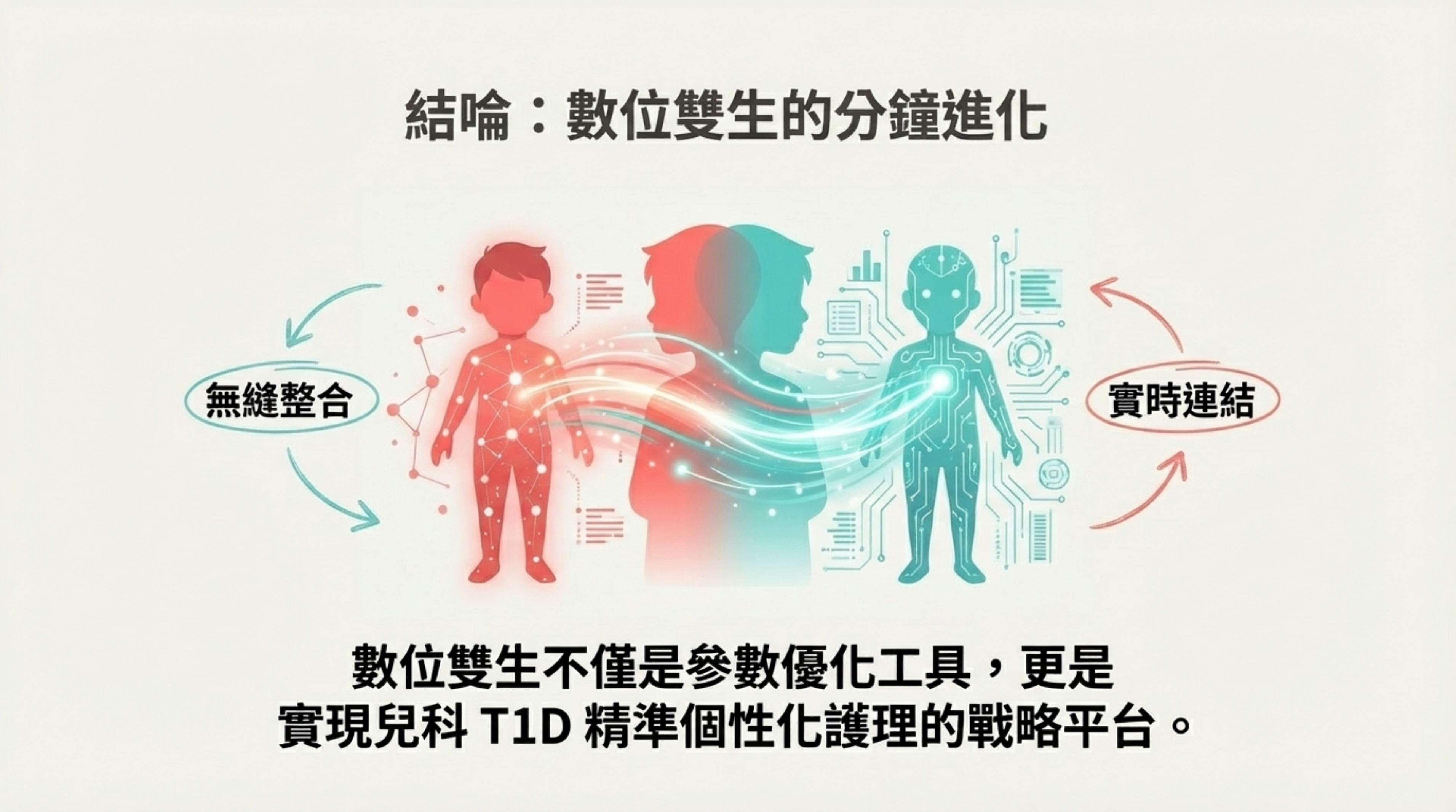 說明: 結語頁面,視覺上真實兒童與數位化身無縫融合。 總結全文:數位雙生不僅僅是一個參數優化工具,它是實現兒科 T1D 精準個性化護理 (Precision Medicine) 的戰略平台。透過無縫整合(Seamless Integration)與實時連結(Real-time Connection),它讓治療方案能隨著孩子的成長而動態演進,真正實現了「以人為本」的科技醫療 。