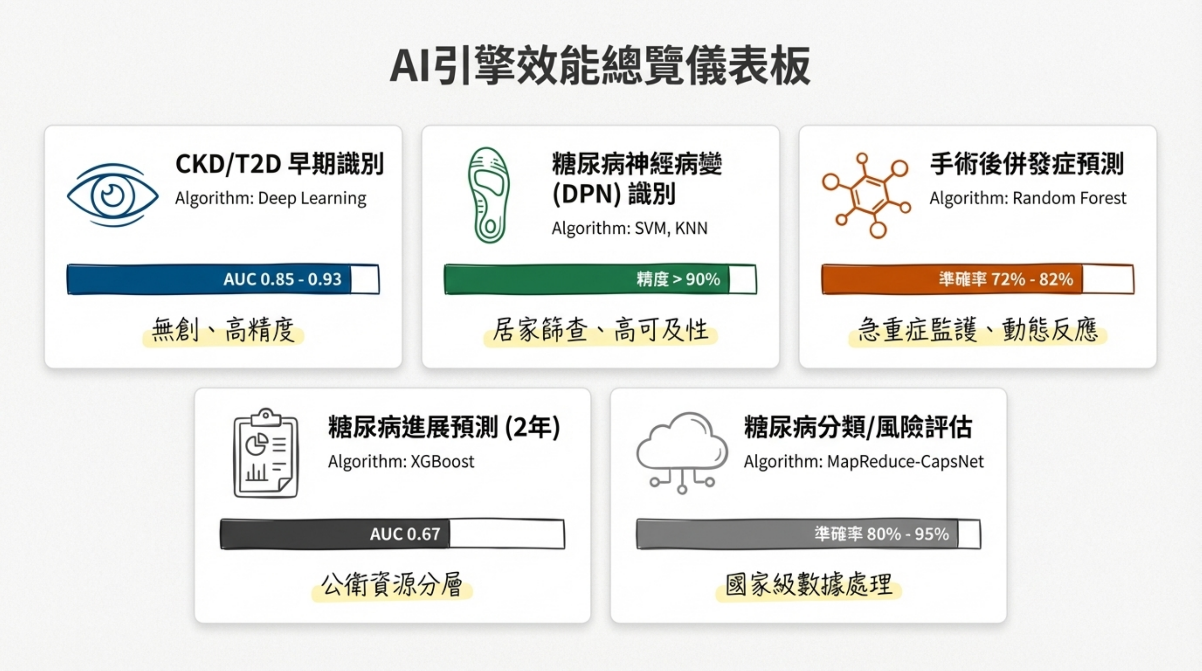 CKD/T2D 早期識別 (Deep Learning): AUC 0.85 - 0.93,具備無創、高精度優勢 。