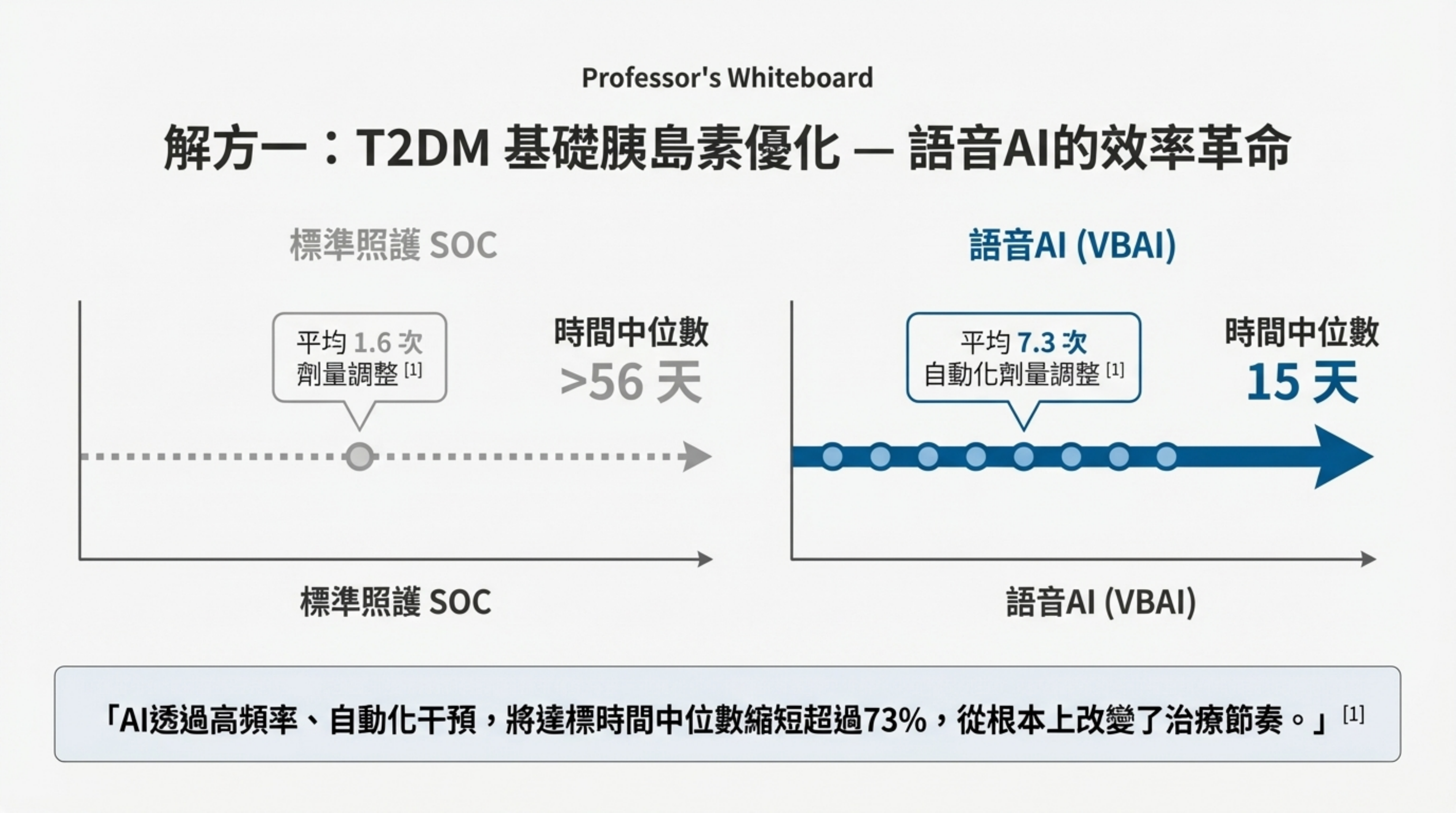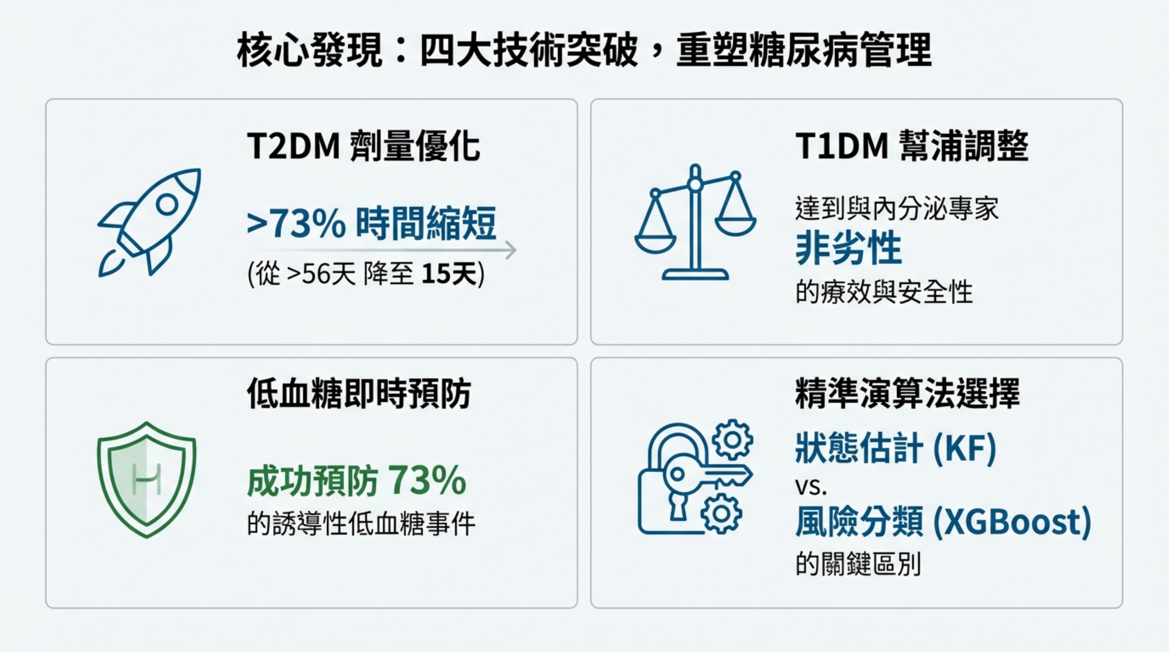 T2DM 劑量優化(效率革命):針對第二型糖尿病,AI 解決了傳統照護中劑量調整緩慢的問題,將達到最佳胰島素劑量的時間縮短了 73% 以上(從 >56 天縮短至 15 天)。