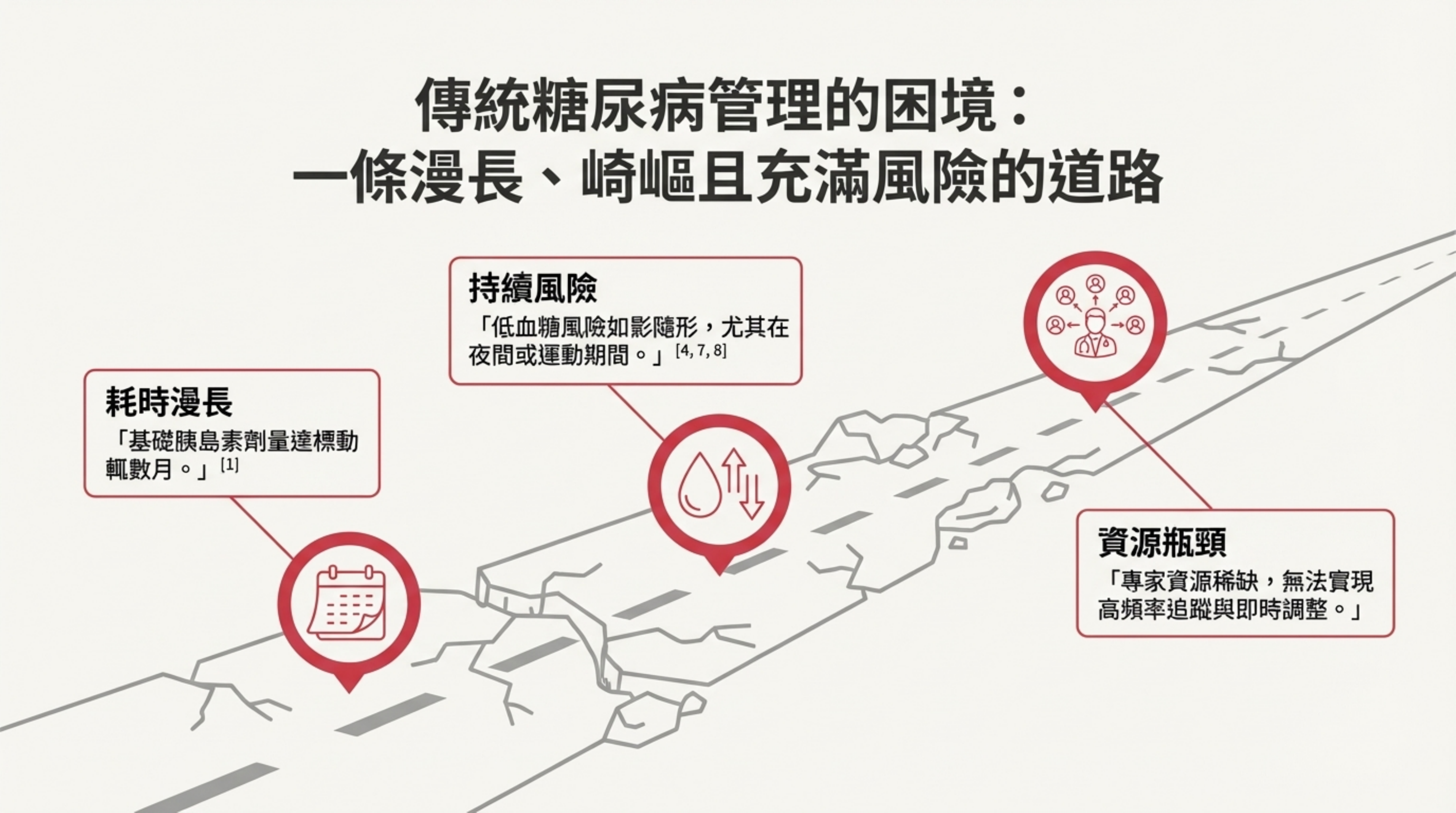 Slide 2: 傳統糖尿病管理的困境:一條漫長、崎嶇且充滿風險的道路
