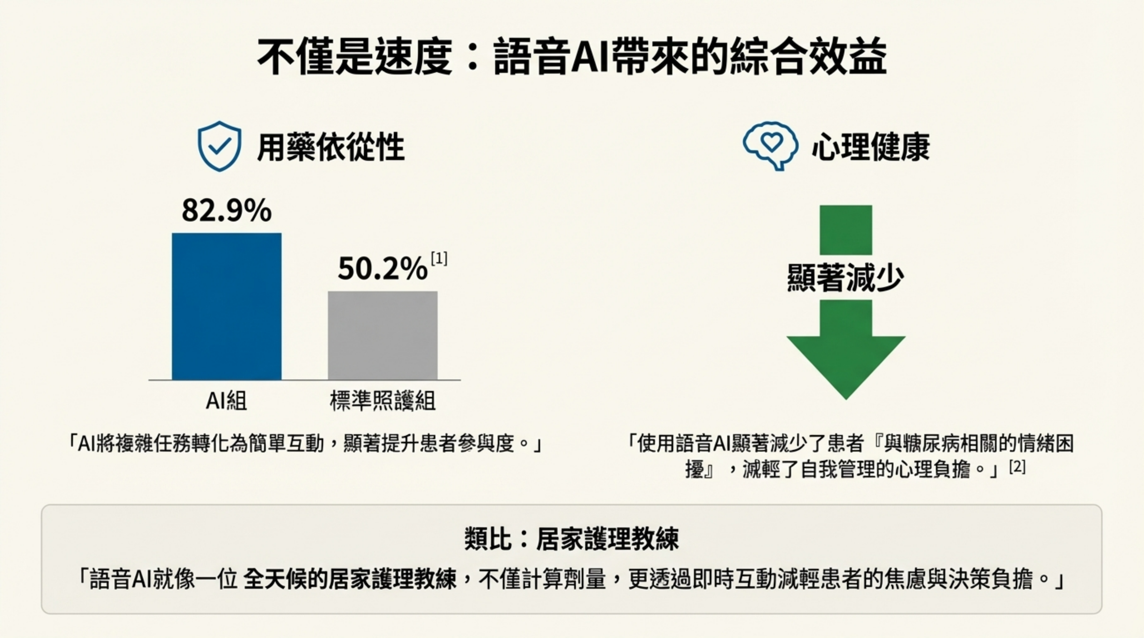 - 依從性與心理健康:AI 組的胰島素依從性高達 82.9% (SOC 組 50.2%)。語音 AI 如同「居家護理教練」,降低了技術門檻與患者的情緒困擾 (Diabetes distress) 。