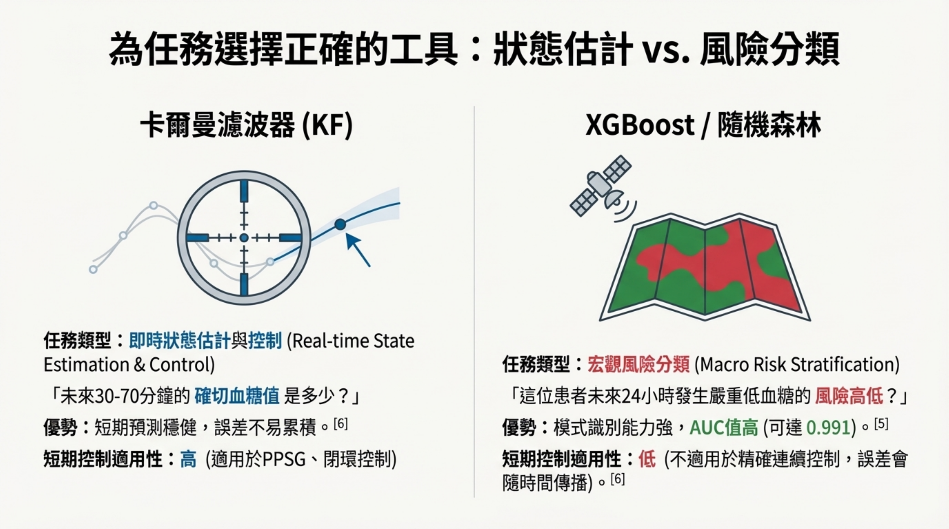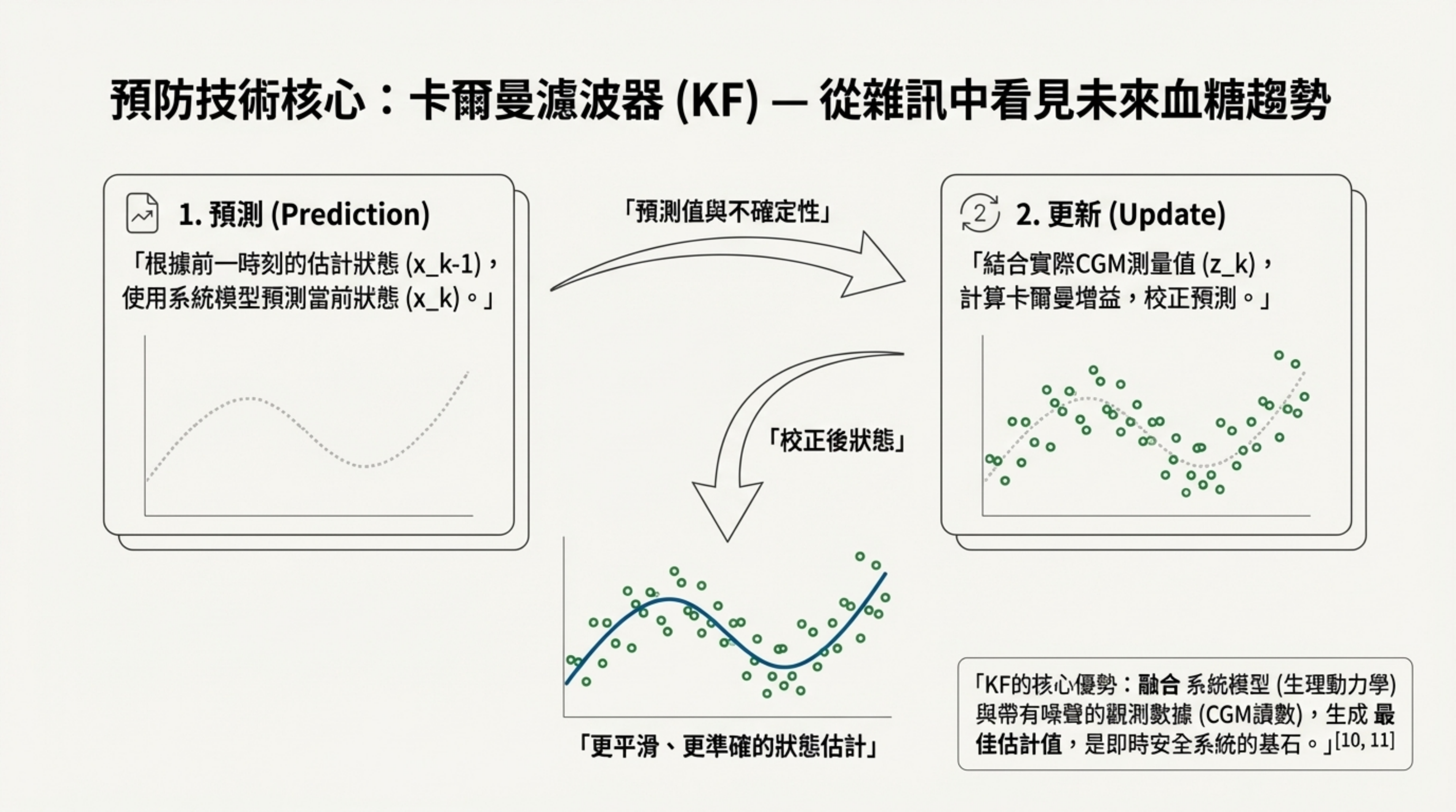 - 運作原理:KF 是一種狀態估計算法。它不只看當下的 CGM 數值(常含噪聲),而是結合「生理模型預測」與「傳感器測量值」,過濾雜訊以估計真實血糖狀態 。